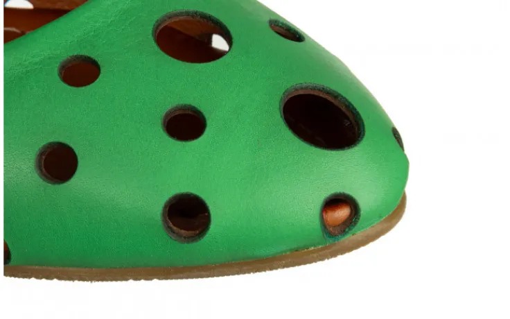 Baleriny płaskie z oddychającą ażurowaną cholewką. Wnętrze w całości skórzane. Zapiętek z miłego w dotyku zamszu, który niweluje możliwość otarć pięty. Antypoślizgowa podeszwa z gumy zapewnia trwałość i przyczepność. Odczuwalna miękkość to zasługa miękkich skór użytych w produkcji tego modelu.