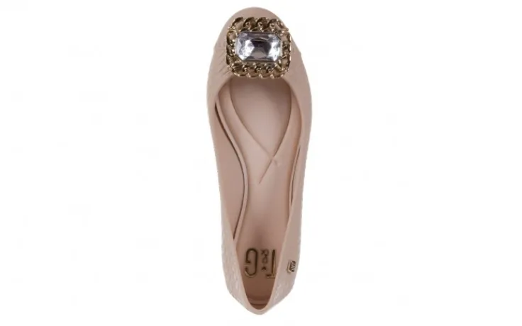 Beżowe baleriny marki T&G Fashion. Na noskach duży kryształ oplatany łańcuchem w kolorze złotym. Buty idealnie sprawdzą się podczas ciepłych, letnich dni. Wyjmowana wkładka wykonana z miękkiej gąbki.