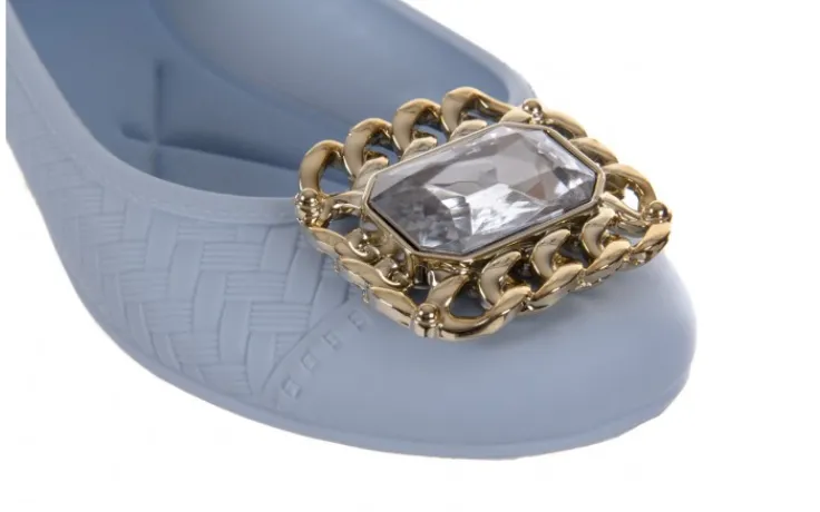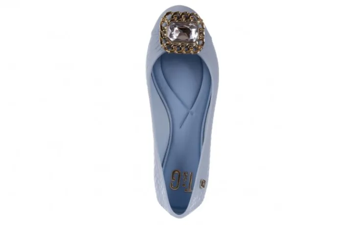 Niebieskie baleriny marki T&G Fashion. Na noskach duży kryształ oplatany złotym łańcuchem. Buty idealnie sprawdzą się podczas ciepłych, letnich dni. Wyjmowana wkładka wykonana z miękkiej gąbki.