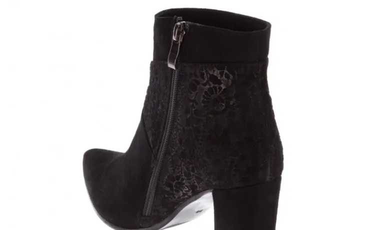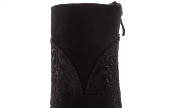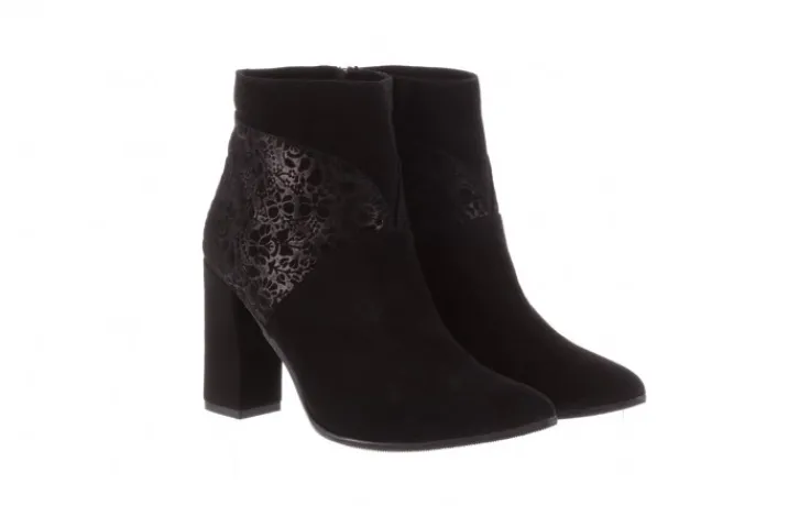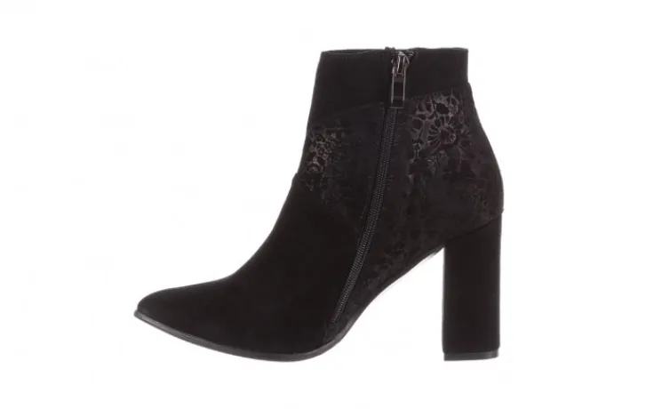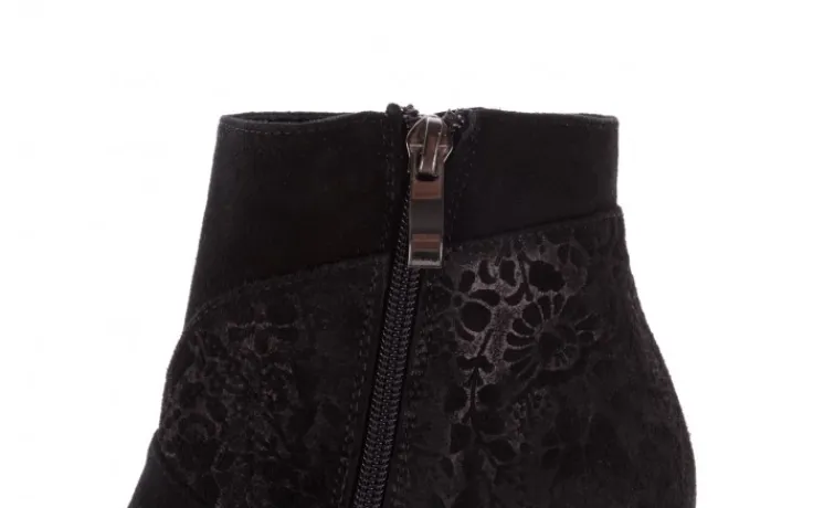 Wkładka wykonana z ocieplanego materiału w kolorze czarnym. Wyściółka z materiału. Botki na wygodnym 9-centymetrowym obcasie. Obuwie zasuwane na zamek po wewnętrznej stronie cholewki. Buty z boku cholewki oraz na zapiętku posiada tłoczony, kwiatowy wzór.