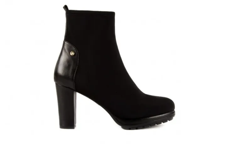 Cholewka jak i wysciółka wykonane w całości ze strechu w kolorze czarnym. Na pięcie wstawka ze skóry naturalnej. Botki na 9 cm obcasie, który niweluje posówka wysokości 2 cm. Podsówka zapewni dodatkową izolację termiczną.