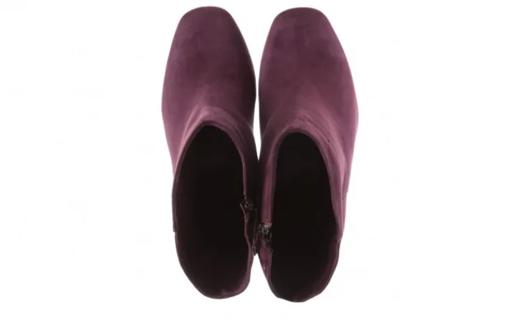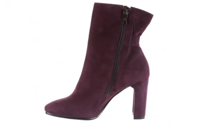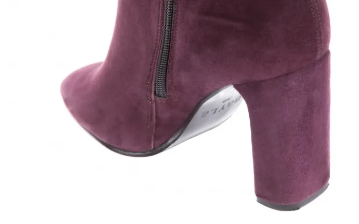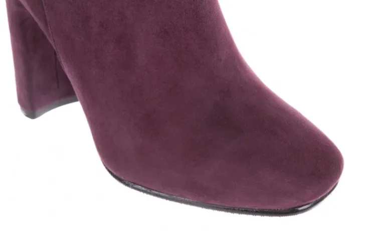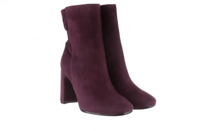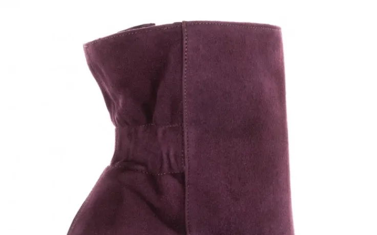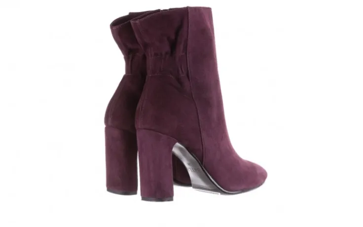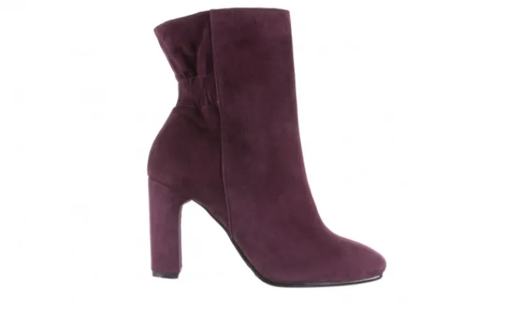 Botki na obcasie marki Bayla wykonane z naturalnej skóry zamszowej typu nubuk w kolorze śliwkowym.