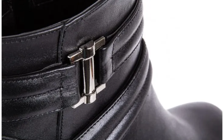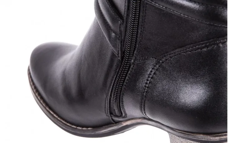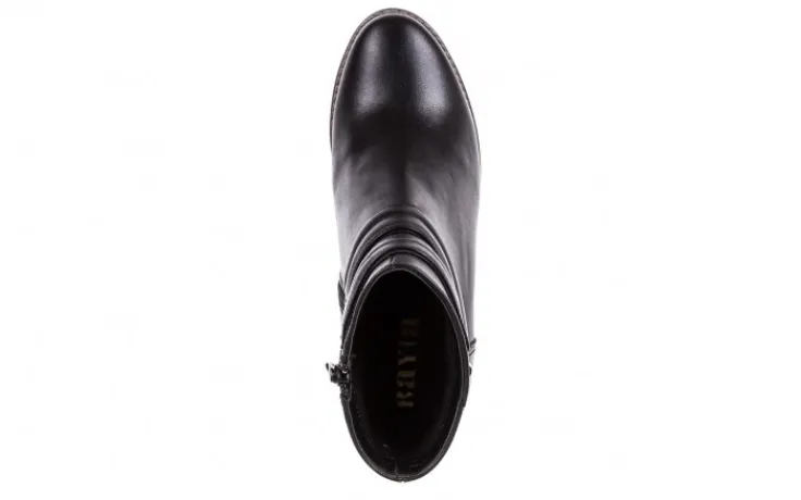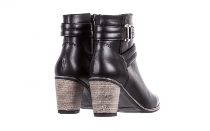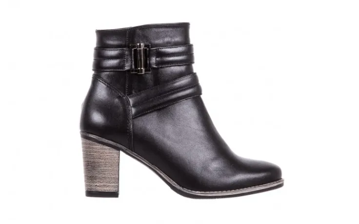 Czarne botki marki BAYLA na obcasie typu słupek wykonane są w całości z naturalnej skóry licowej. Zamek błyskawiczny ułatwia zakładanie butów. Miękka wkładka i delikatne ocieplenie podnosi komfort użytkowania podczas chłodniejszych dni. Grubsza, antypoślizgowa podeszwa, wykonana z wysokiej jakości tworzywa sztucznego doskonale izoluję stopę od podłoża. Klasyczny fason botków uzupełnia stabilny obcas o fakturze drewna, oraz ozdobne paski zakończone srebrną klamrą.