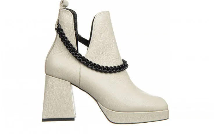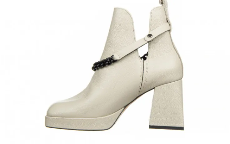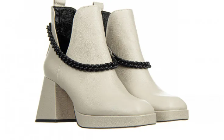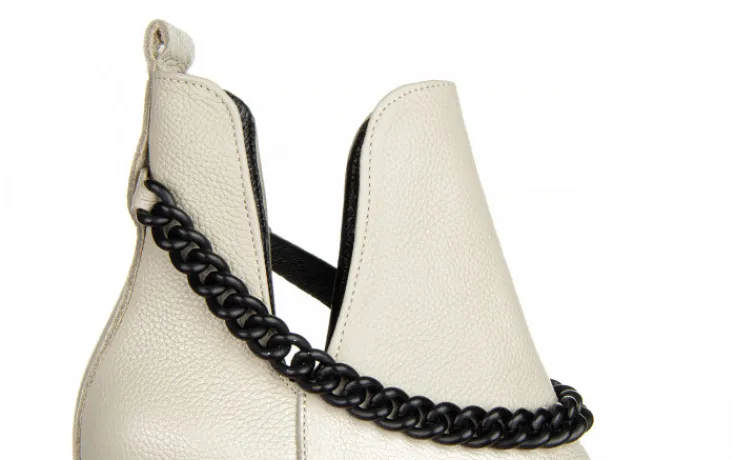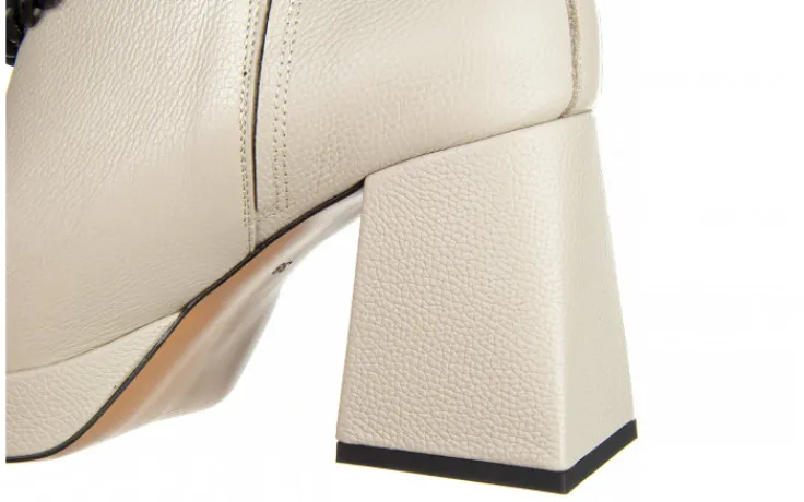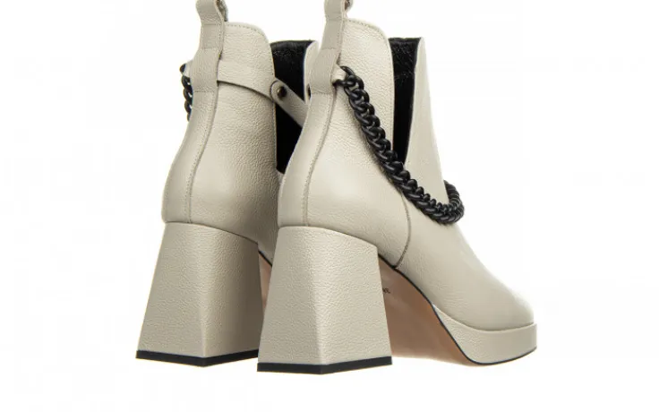 Wkładka oraz wyściółka ze skóry naturalnej licowej zapobiegają poceniu się stóp oraz zapewniają odpowiednią cyrkulację powietrza we wnętrzu buta. Obuwie wsuwane na wygodnym 8,5-centymetrowym obcasie w pięknym geometrycznym kształcie. Platforma niweluje wysokość obcasa sprawiając, że buty są bardzo wygodne. Klasyczna cholewka z modnymi wycięciami po bokach przyozdobiona odpinanym matowym łańcuszkiem w kolorze czarnym. Z boku od wewnętrznej strony wszyta gumka ułatwiająca zakładanie. Botki z kwadratowym noskiem to nieodłączna część modnej garderoby w nadchodzącym sezonie.
