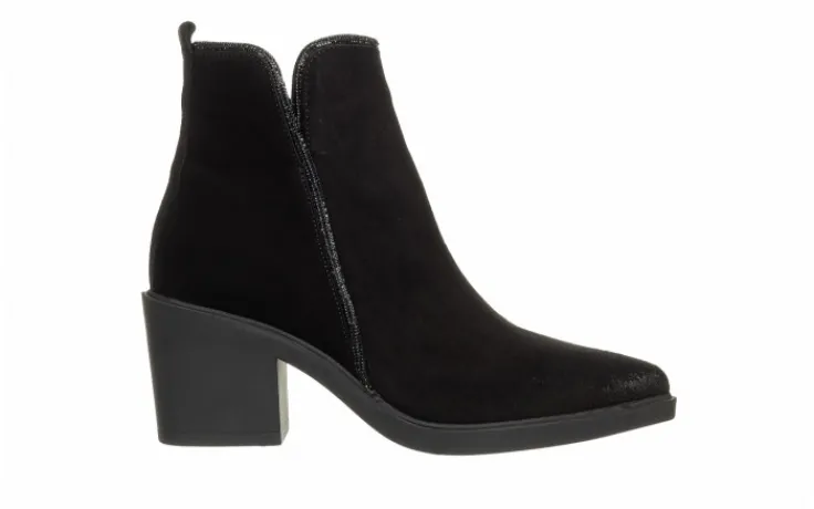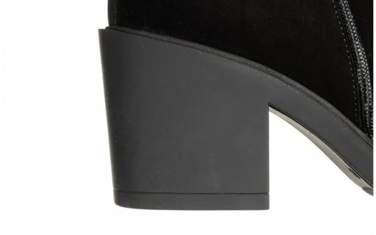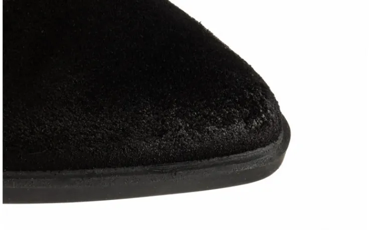 Botki zasuwane wykonane z miękkiej skóry zamszowej wysokiej jakości. Cholewka z delikatnie mieniącymi się wykończeniami o asymetrycznym wykończeniu. Nosek w szpic wygląda kobieco i optycznie wysmukla nogi. Wnętrze w całości ocieplane ciepłym polarem. Botki na wygodnym, gumowym obcasie.