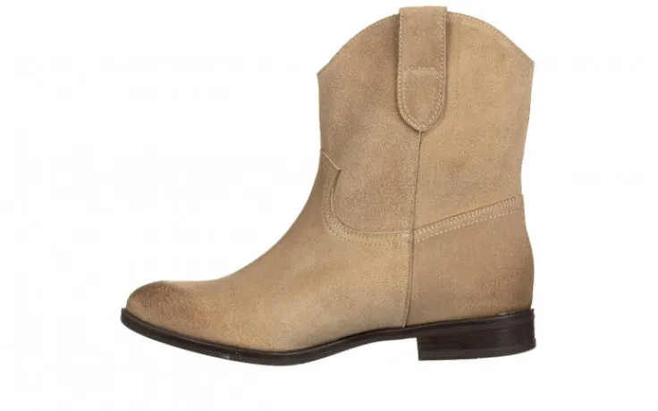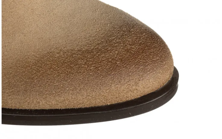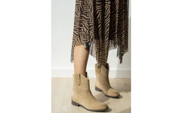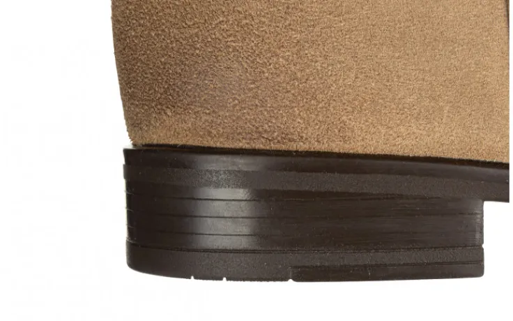 Botki wsuwane wykonane z naturalnej skóry zamszowej wysokiej jakości. Cholewka o asymetrycznym zakończeniu z charakterystycznymi przeszyciami. Wnętrze z naturalnej skóry. Gumowa podeszwa o właściwościach antypoślizgowych.