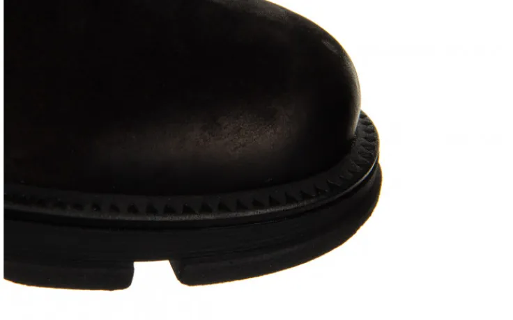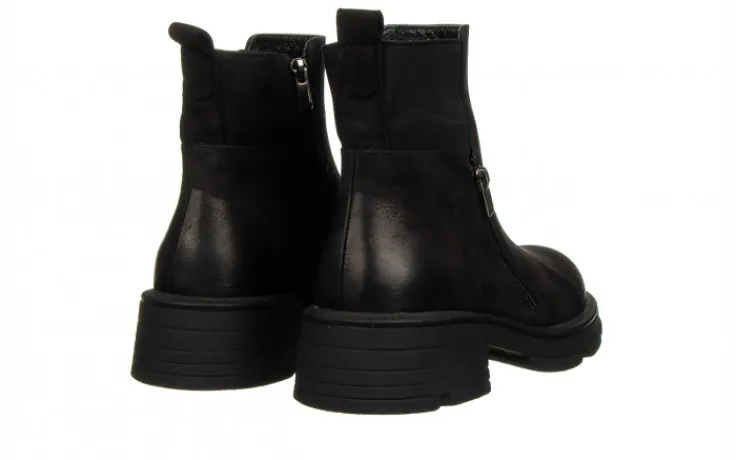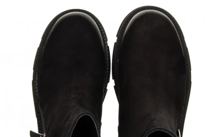 Botki damskie zasuwane z cholewką sięgającą za kostkę. Cholewka z zewnętrznej strony przyozdobiona zasuwakiem oraz elastyczną gumą. Gumowa, antypoślizgowa podeszwa amortyzuje wstrząsy oraz izoluje stopę od zimnego podłoża. Wyściółka z miękkiego materiału, wkładka z miękkiej gąbki pokrytej skórą naturalną.. Model z okrągłym noskiem.