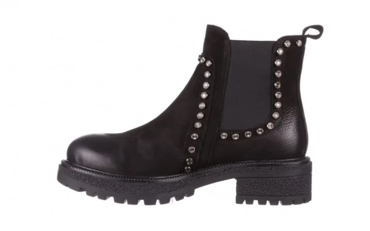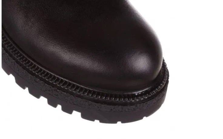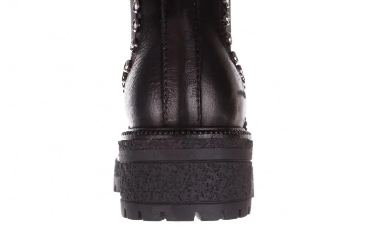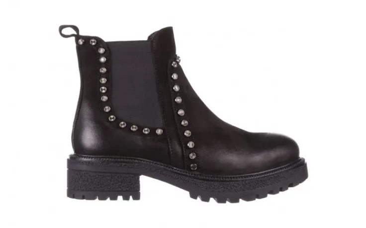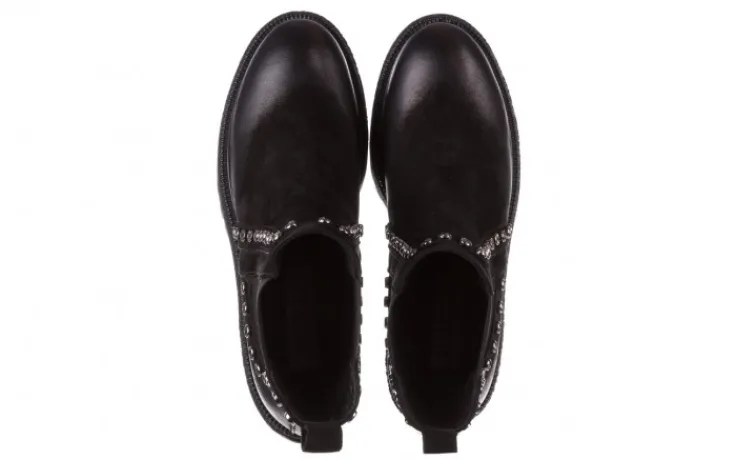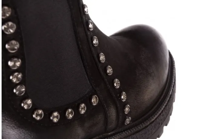Wkładka ze skóry naturalnej, wyściółka delikatnie ocieplone w kolorze czarnym. Botki na wygodnym 4,5-centymetrowym obcasie. Z boku wszyte gumki ułatwiające zakładanie. Cholewka ozdobiona dużymi dżetami.