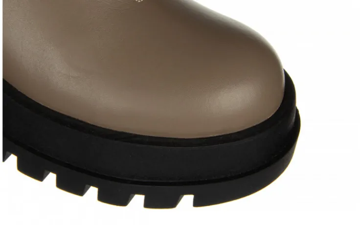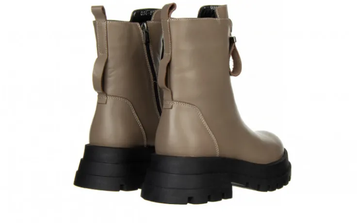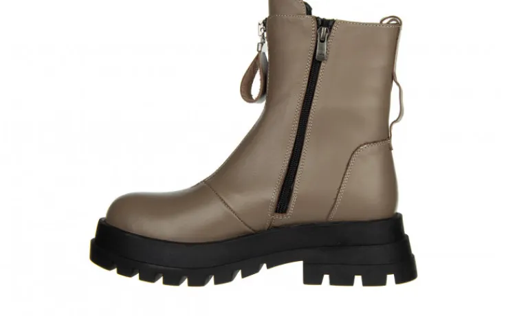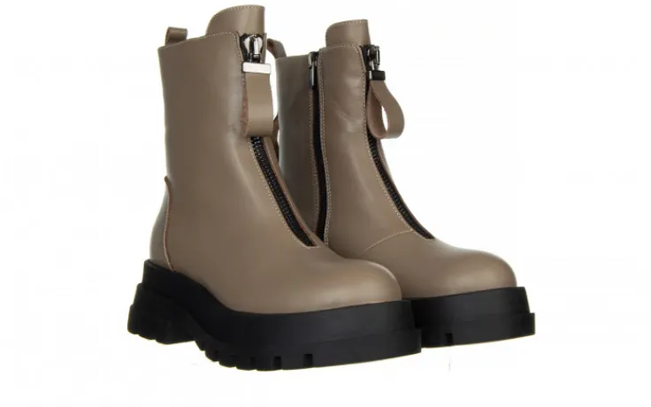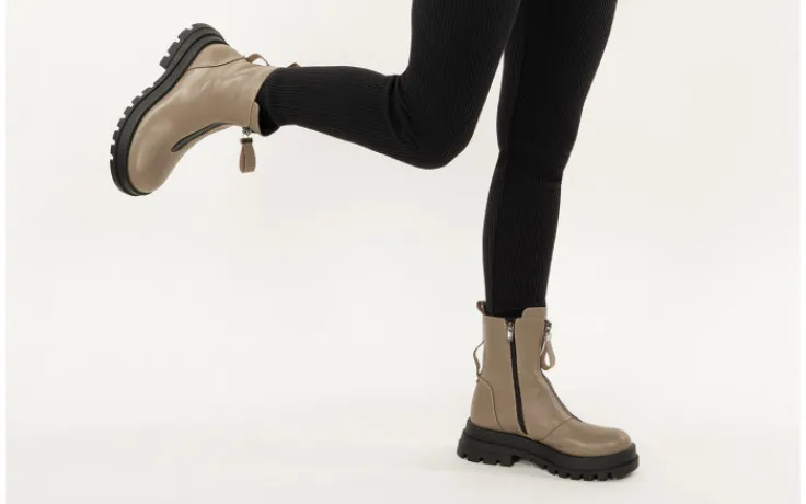 Wyższa cholewka wykonana jest z bardzo miękkiej skóry licowej w jesiennym, ciemnobeżowym kolorze. Model przyozdobiony na przodzie imitacją zasuwaka. Dla ułatwienia zakładania i zdejmowania obuwia zasuwak po wewnętrznej stronie butów. Platforma dodaje centymetrów i przy tym sprawia, że buty stają się bardzo wygodne. Antypoślizgowa, gumowa podeszwa z głębszym bieżnikiem amortyzuje wstrząsy oraz izoluje stopę od zimnego podłoża. Wkładka oraz cholewka ocieplana od wewnątrz miękkim polarem obuwniczym.