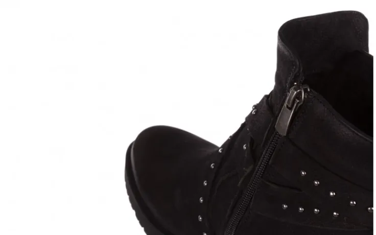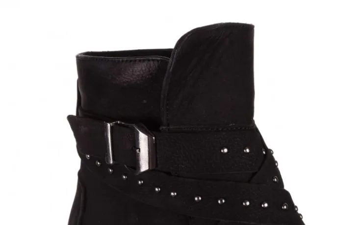Wkładka ze skóry naturalnej, wyściółka delikatnie ocieplone w kolorze czarnym. Botki na wygodnym 5,5-centymetrowym obcasie. Z boku zasuwane na zamek. Wokół cholewki biegną skórzane paski ozdonione dżetami zakończone klamrą.