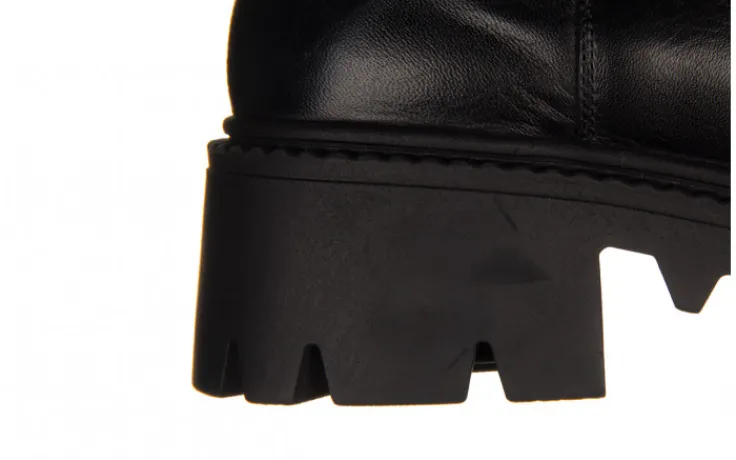 Wsuwane botki damskie w typie sztybletów z cholewką sięgającą za kostkę. Wbudowane gumowanie po bokach ułatwia zakładanie. Gumowa, antypoślizgowa podeszwa amortyzuje wstrząsy oraz izoluje stopę od zimnego podłoża. Wyściółka z ocieplanego materiału. Wkładka wykonana z miękkiej gąbki pokrytej skórą naturalną. Okrągły nosek oraz ząbkowana podeszwa, która jest odzwierciedleniem najnowszej mody.