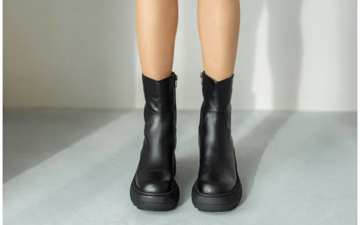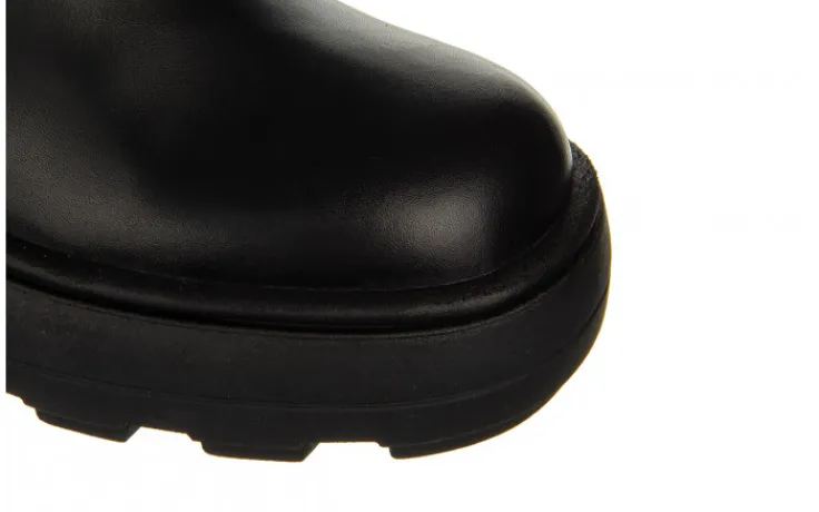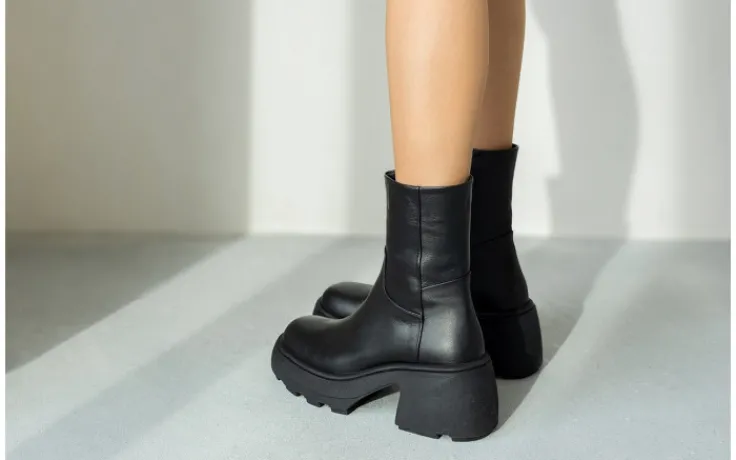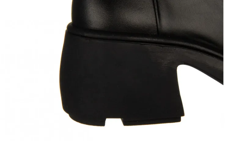 Zasuwane botki damskie z cholewką sięgającą za kostkę. Efektowna gumka z zewnętrznej strony. Gumowa, antypoślizgowa podeszwa amortyzuje wstrząsy oraz izoluje stopę od zimnego podłoża. Wnętrze w całości ocieplane. Klasyczny okrągły nosek. Wysoka platforma, która jest odzwierciedleniem najnowszej mody.