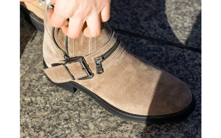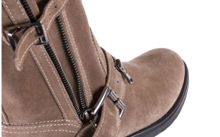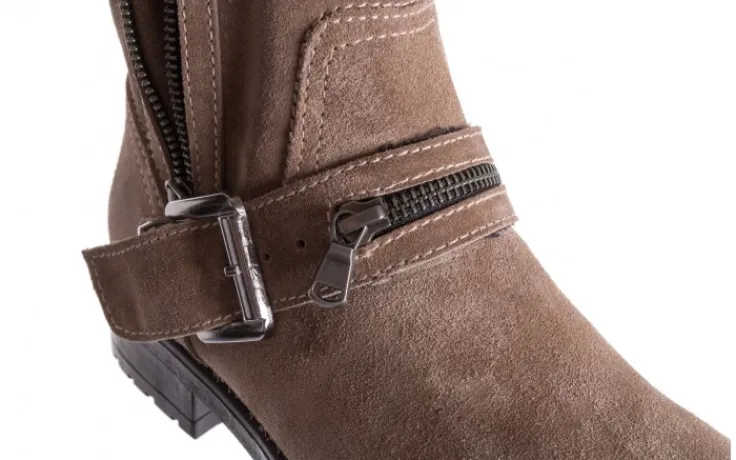 Beżowe botki marki BAYLA w całości wykonane z nubuku. Zamek z zewnętrznej strony ułatwia zakładanie obuwia, a klamra u góry pozwala na dopasowanie się cholewki do obwodu łydki.