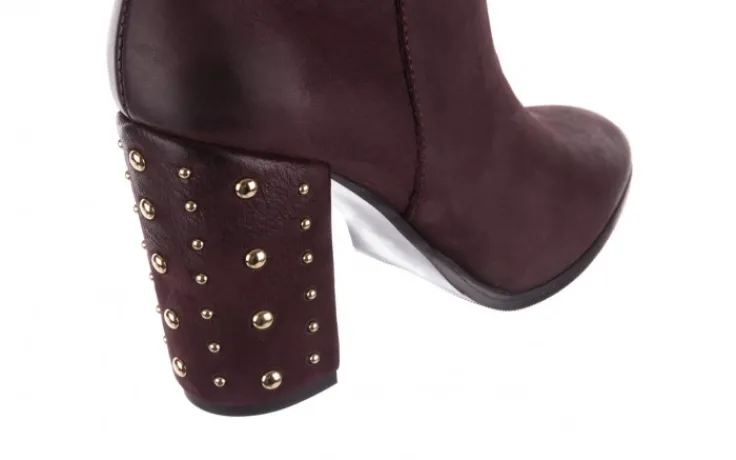 Wkładka oraz wyściółka wykonana z ocieplanego materiału w kolorze czarnym. Buty na wygodnym 9,5-centymetrowym obcasie. Obuwie zasuwane na zamek po wewnątrznej stronie cholewki. Obcas ozdobiony małymi, złotymi dżetami.