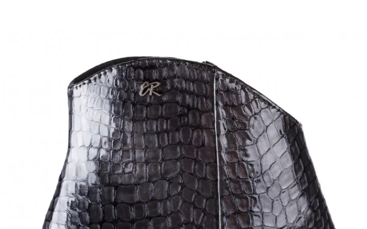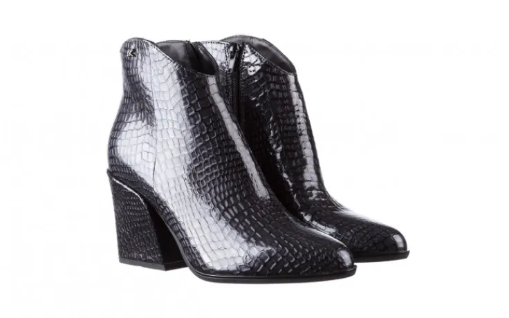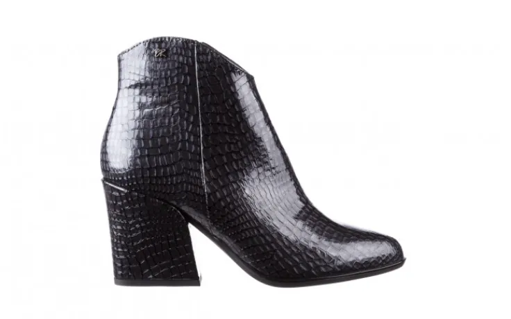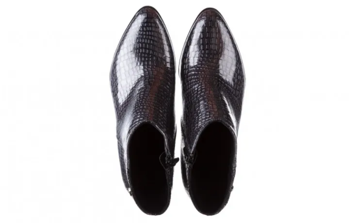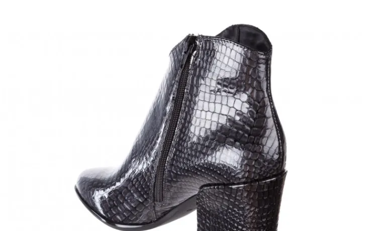 Botki marki Bayla wykonane z naturalnej skóry lakierowanej w kolorze szarym, stalowym z wężowym wzorem.
