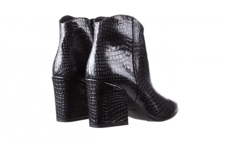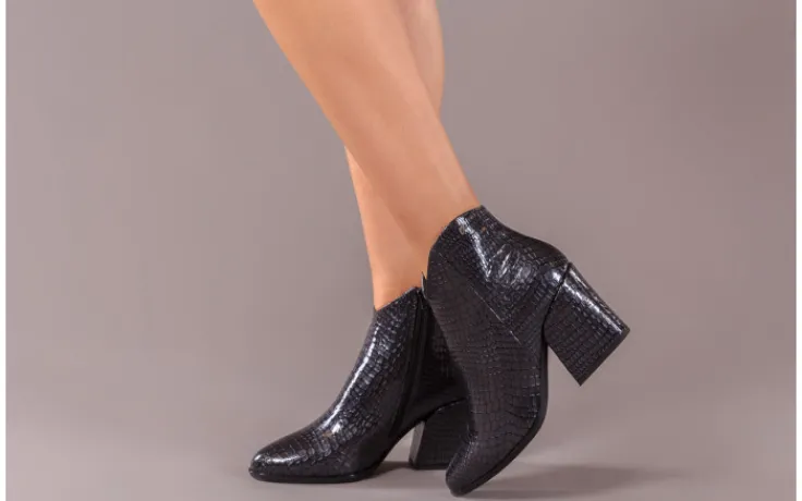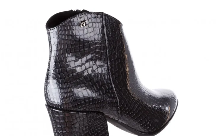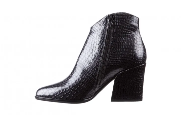 Wkładka oraz wyśćiółka delikatnie ocieplana w kolorze czarnym. Botki na wygodnym 7,5-centymetrowym obcasie. Z boku zasuwane na zamek. Cholewka zakończona nieregularnym wycięciem z przodu.