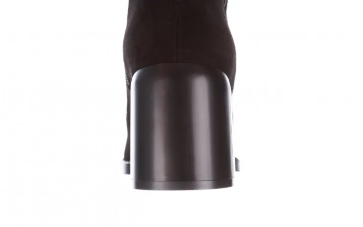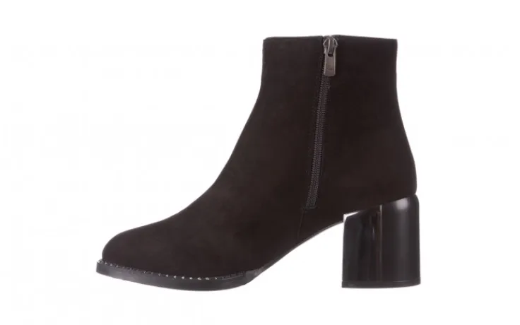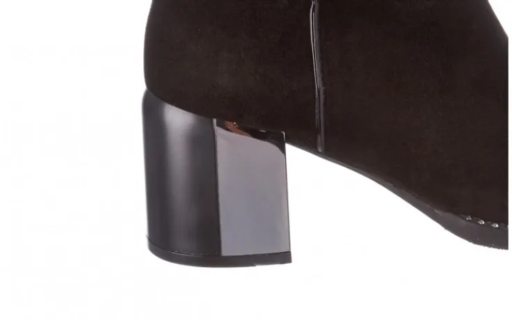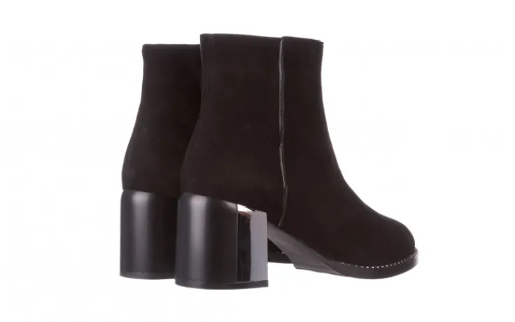 Wkładka oraz wyściółka delikatnie ocieplana w kolorze czarnym. Botki na wygodnym 7-centymetrowym obcasie, który w połowie obity jest blaszką. Obuwie zasuwane na zamek. Klasyczna cholewka o prostym kształcie.