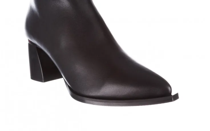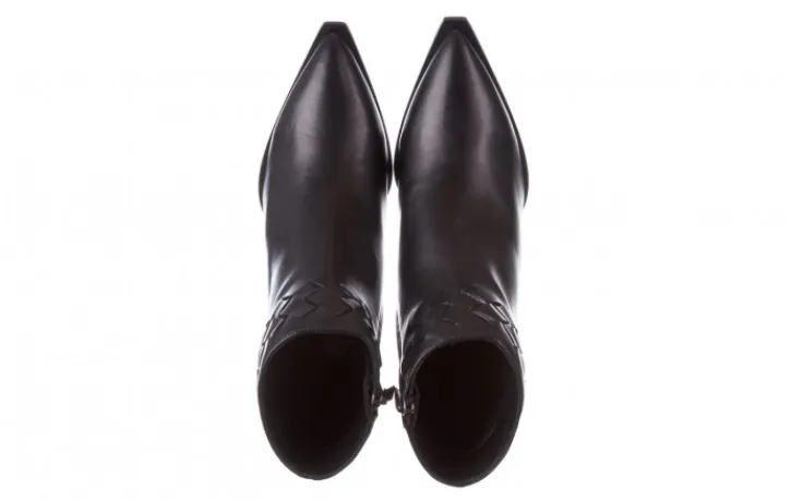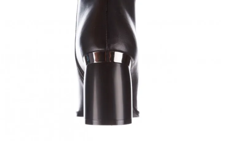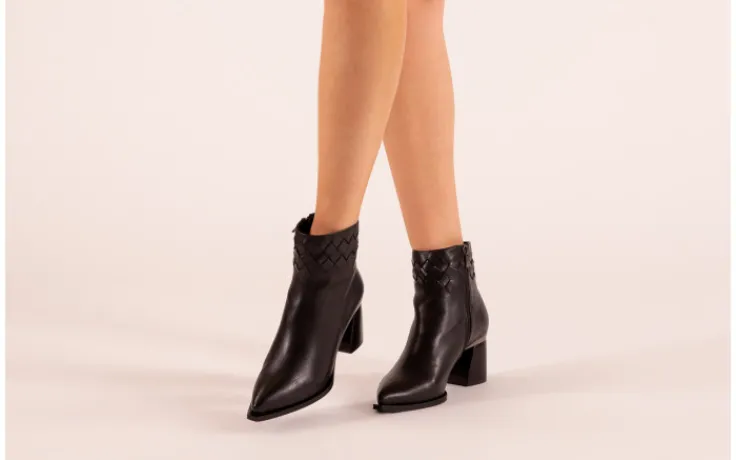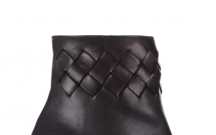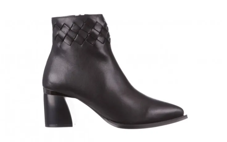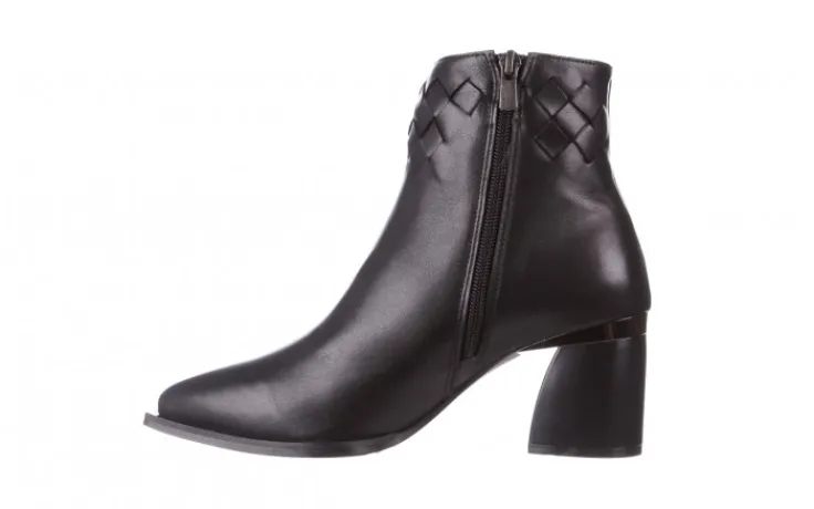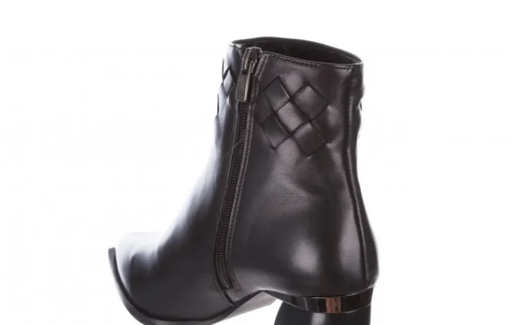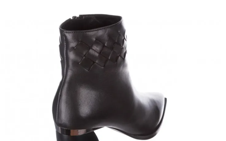 Wkładka oraz wyściółka delikatnie ocieplana w kolorze czarnym. Botki na wygodnym 7-centymetrowym obcasie, który przy cholewce obity jest blaszką. Obuwie zasuwane na zamek. Klasyczna cholewka o prostym kształcie, która w górnej części posiada pleciony wzór.