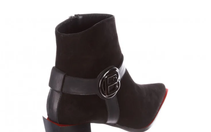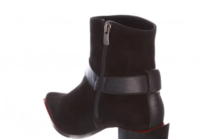Wkładka oraz wyściółka delikatnie ocieplana w kolorze czarnym. Botki na wygodnym 7,5-centymetrowym obcasie o ciekawym kontrastowym, kwadratowym kształcie. Obuwie zasuwane na zamek. Przez cholewkę biegnie pasek ze skóry licowej ozdobiony literą z logo firmy Bayla: „B”. Podeszwa przy cholewce wykończona czerwienią.