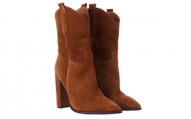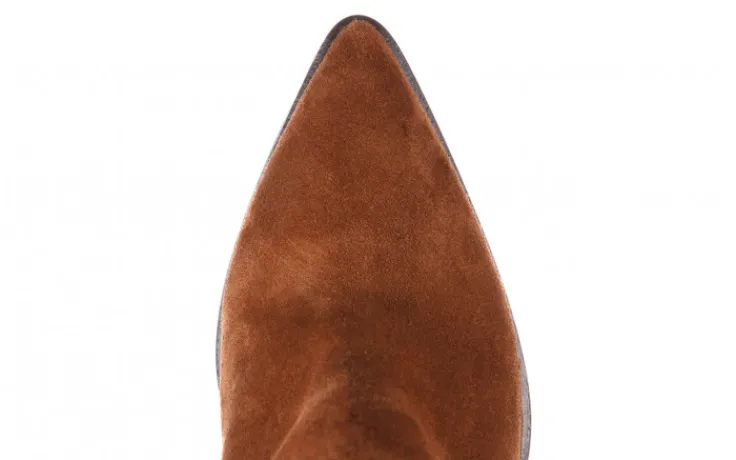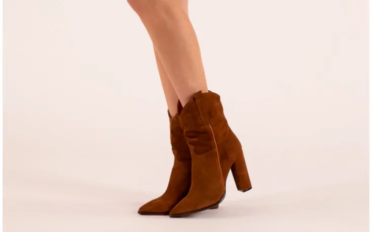 Wkładka ze skóry naturalnej w kolorze brązowym. Wyściółka z delikatnie ocielanego materiału w ciemnym odcieniu brązu. Botki na wygodnym 10,5-centymetrowym obcasie pokrytym skórą. Obuwie wsuwane. Klasyczna cholewka w stylu kowbojek.