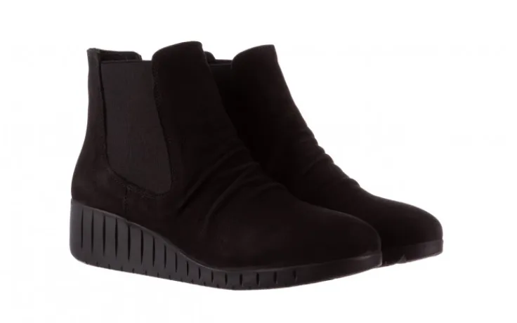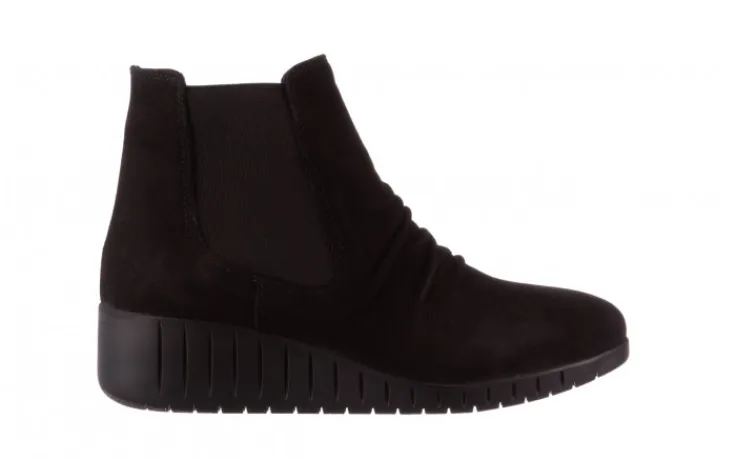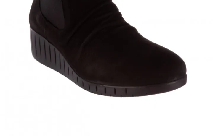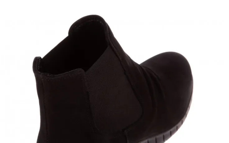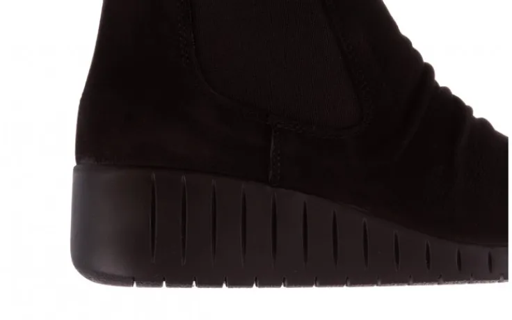 Wkładka wykonana ze skóry naturalnej w kolorze czarnym. Wyściółka z delikatnie ocieplanego materiału w kolorze czarnym. Botki na wygodnym 4,5-centymetrowym koturnie. Obuwie wsuwane, posiada wszytą gumę ułatwiającą zakładanie obuwia. Klasyczna cholewka o prostym kształcie. Modna, gruba podeszwa z faktorem. Przód cholewki modnie marszczony.