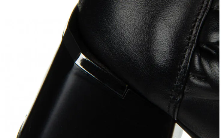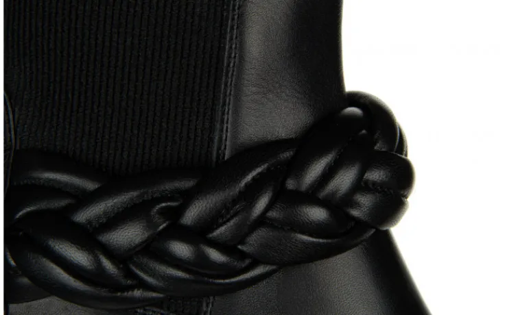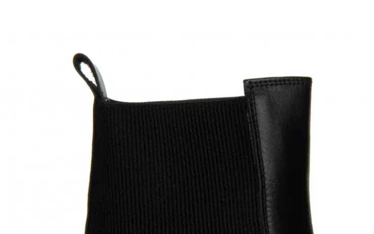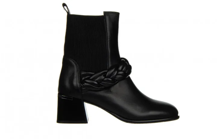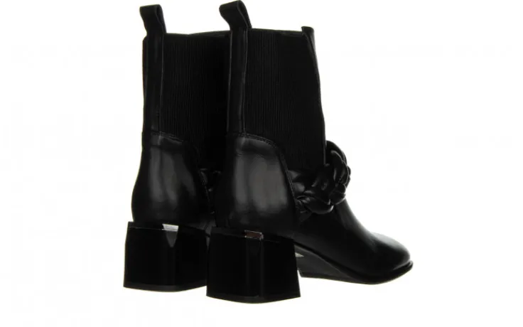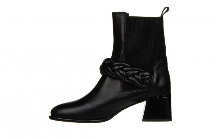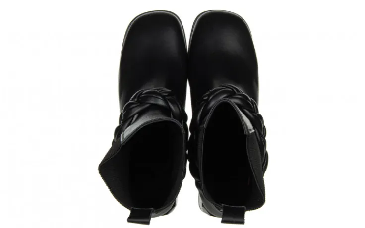 Botki z wyższą cholewką, częściowo wykonaną z elastycznego materiału są łatwe w zakładaniu i bardzo ładnie prezentują się na nodzę. Na cholewce ozdoba w formie warkocza. Niewysoki obcas jest wygodny i stabilny, na brzegu metaliczne wykończenie. Wkładka oraz wyściółka ocieplane. Model z kwadratowym noskiem to nieodłączna część modnej garderoby w nadchodzącym sezonie, bardzo komfortowy dla stóp.