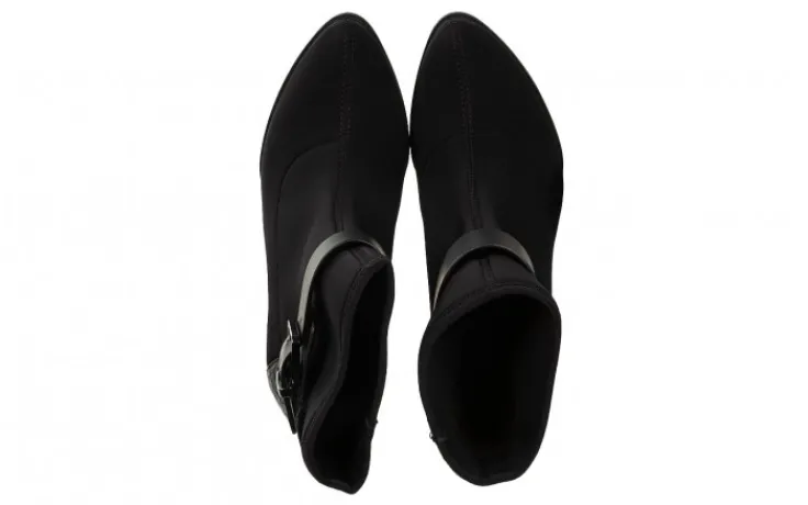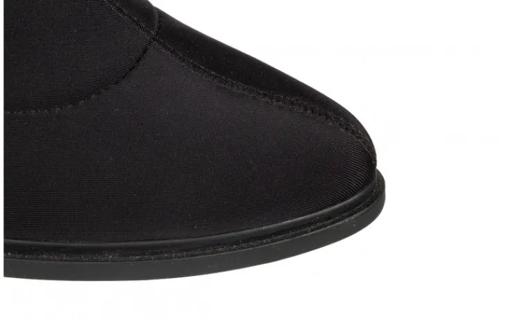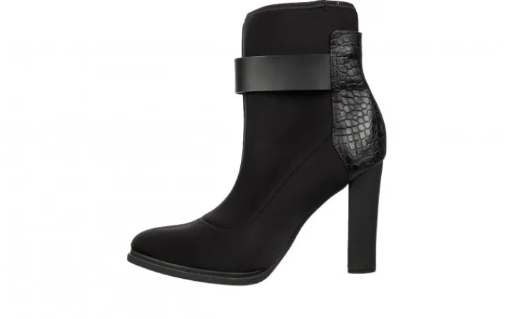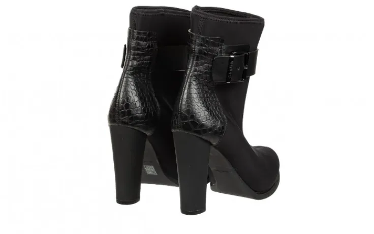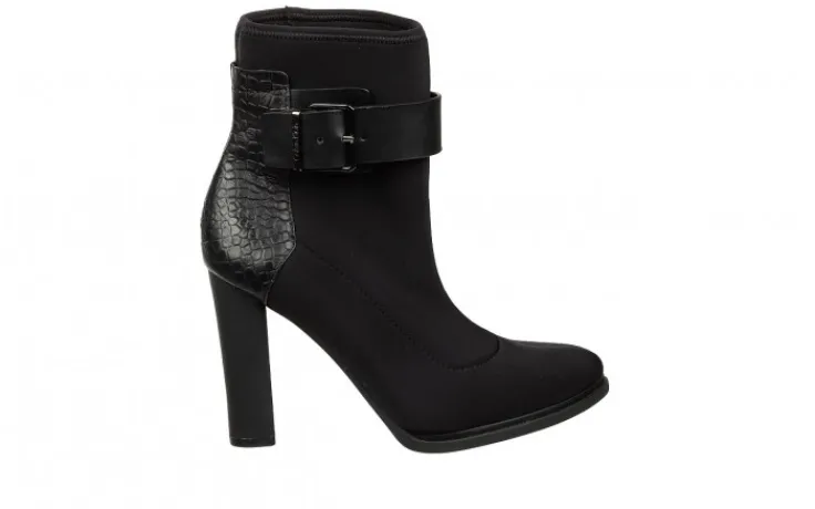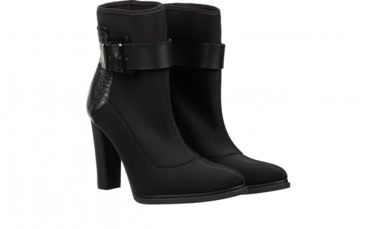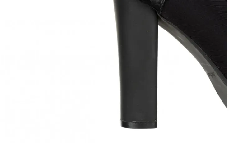 Botki wykonane z zewnątrz z połączenia skóry naturalnej i materiału. Wnętrze to połączenie materiału i ekologicznej skóry. Słupek z tworzywa w kolorze matowej czerni. Migdałowy nosek jest niesamowicie zgrabny i dodaje gracji. Gumowa podeszwa o właściwościach antypoślizgowych. Obuwie wsuwane z klamrą.