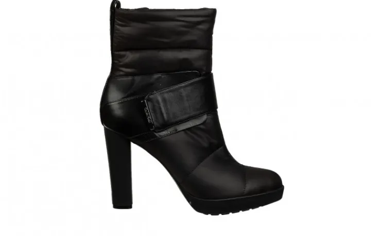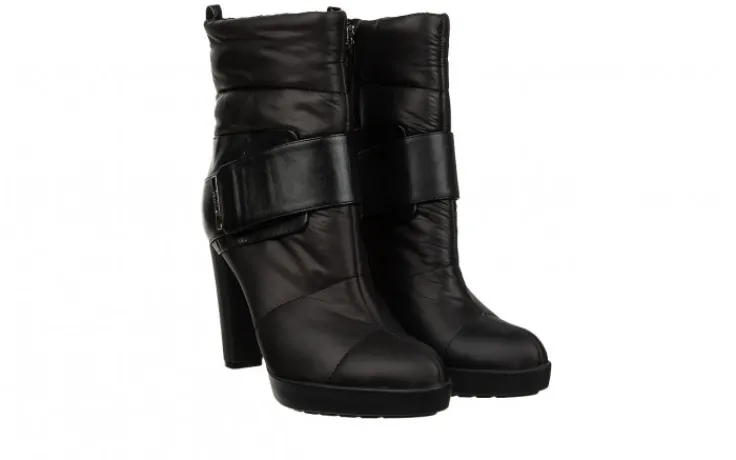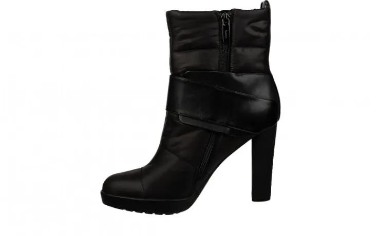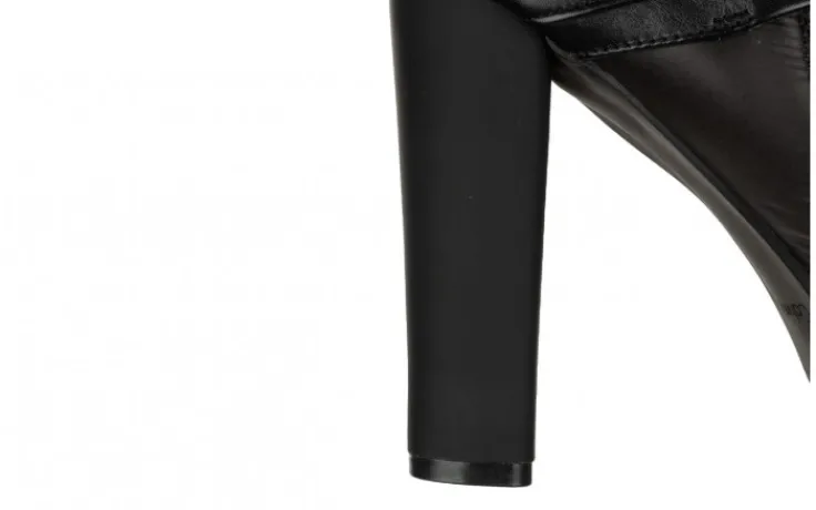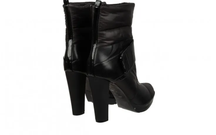 Czarne cholewki wykonano z zapewniającego ciepło nylonu, który miękko otula stopy. Boczne zapięcie na rzep to wstawka ze skóry naturalnej. Logo producenta stanowi wykończenie zapięcia. Dodatkowo od wewnętrznej strony umieszczono zamek, który poprawia funkcjonalność butów. Stabilne obcasy i antypoślizgowe podeszwy uzupełniają całość. Geometryczne linie uwydatniają futurystyczny design.