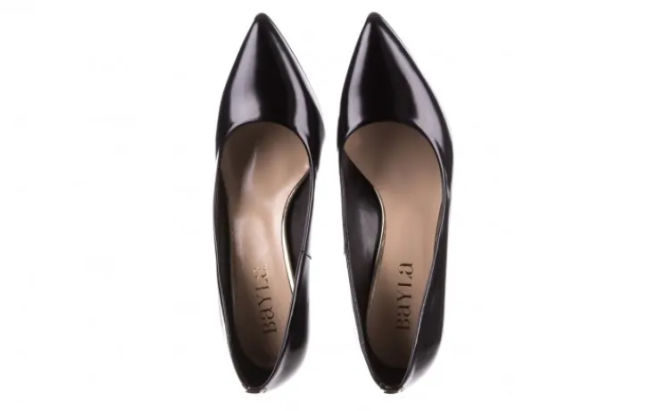 Czarne czółenka Bayla na niskim obcasie typu kaczuszka wykonane z naturalnej skóry licowej wykończonej na wysoki połysk.