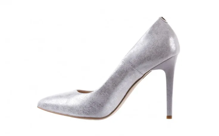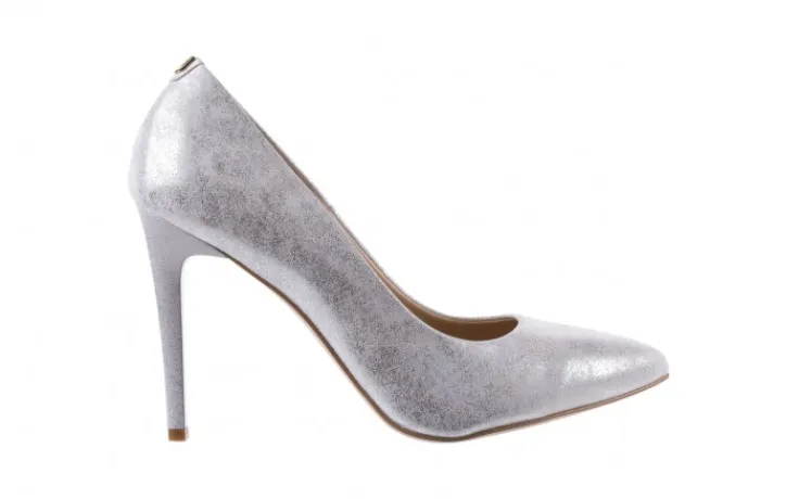 Srebrne metaliczne czółenka marki Bayla ze skóry nubukowej.