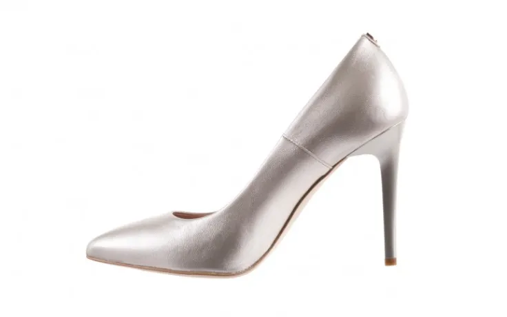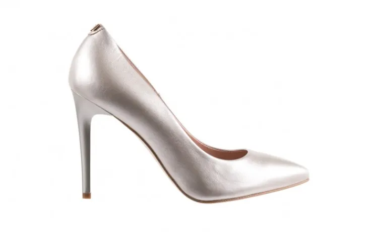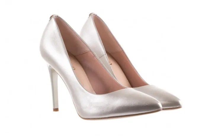 Platynowe czółenka z metalicznym połyskiem marki Bayla wykonane ze skóry naturalnej licowej.
