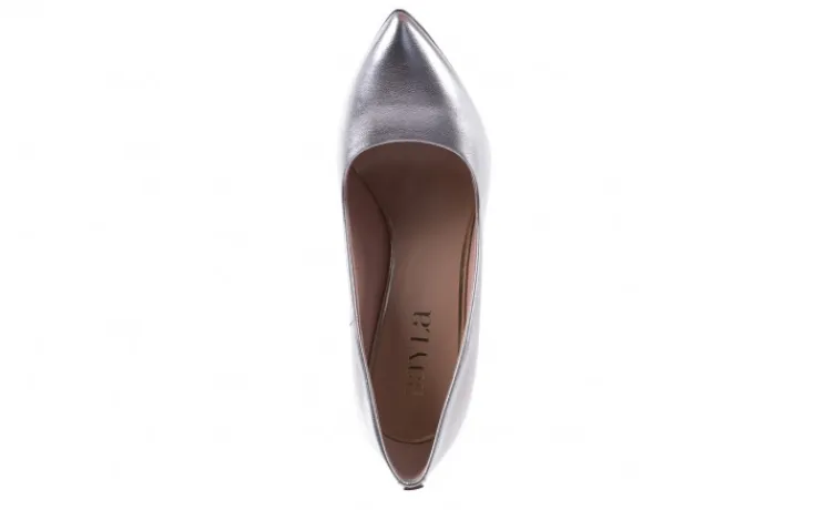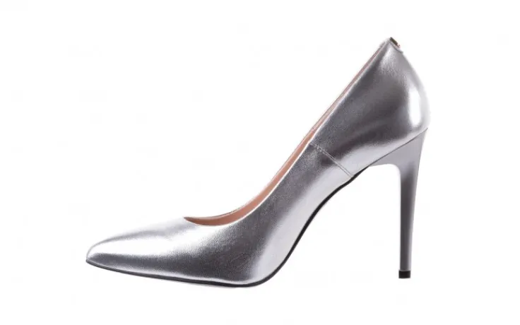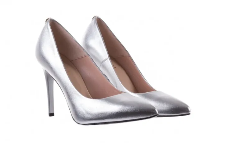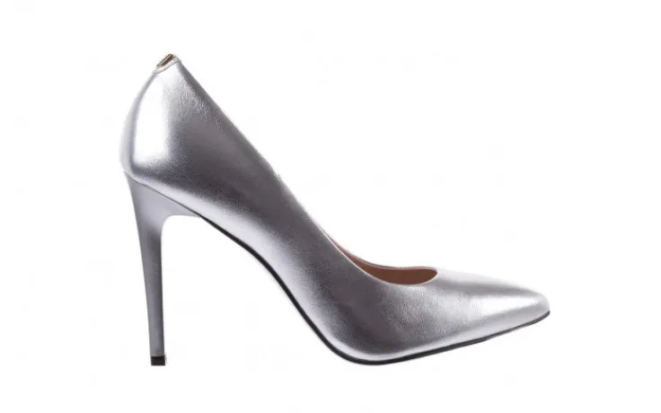 Srebrne czółenka marki Bayla pokryte są nabłyszczaną skórą licową.