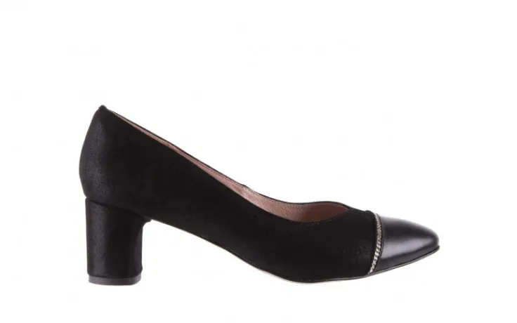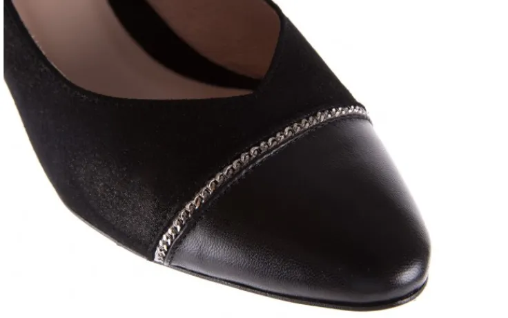 Wkładka oraz wyściółka wykonane ze skóry naturalnej koloru beżowego. Czółenka na wygodnym 5,5- centymetrowym obcasie typu klocek pokryty połyskliwym zamszem. Zwężane w szpic noski. Na czubku buta znajduję się skóra naturalna w kolorze czarnym, wzdłuż której biegnie srebrny łańcuszek.