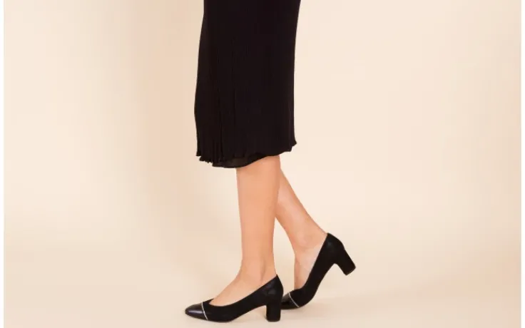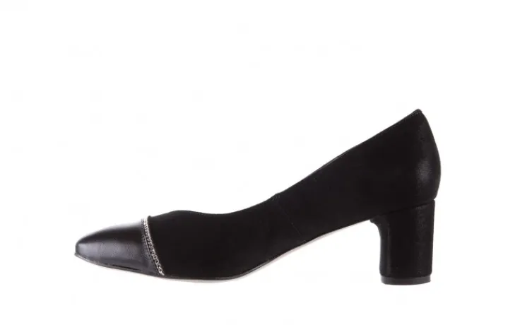 Czółenka marki Bayla wykonane z naturalnej skóry zamszowej w kolorze czarnym pokryte delikatnym połyskiem.