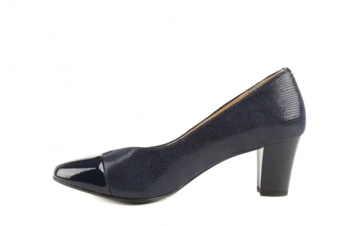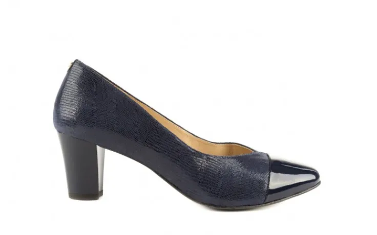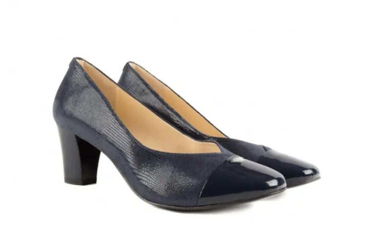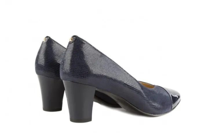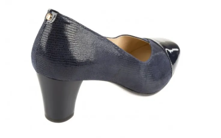 Granatowe czółenka marki Bayla wykonane z miękkiej, tłoczonej skóry dekoracyjnej.