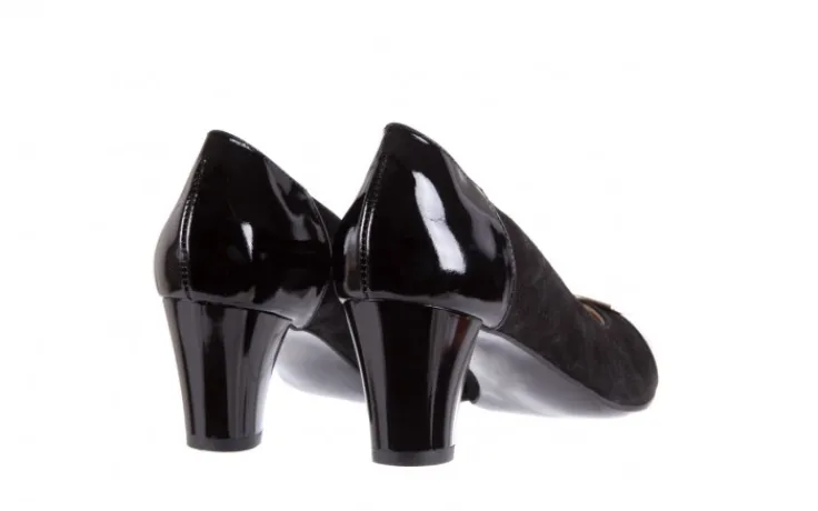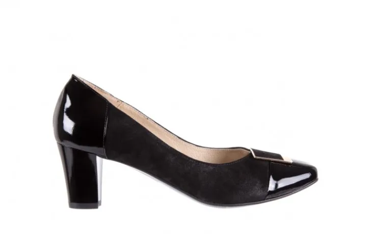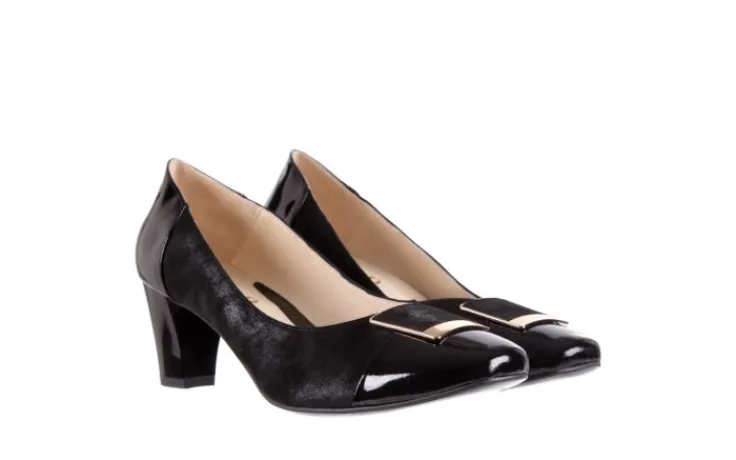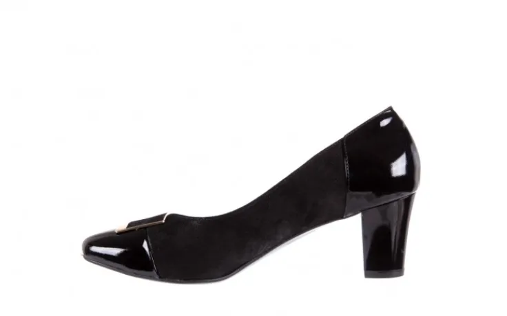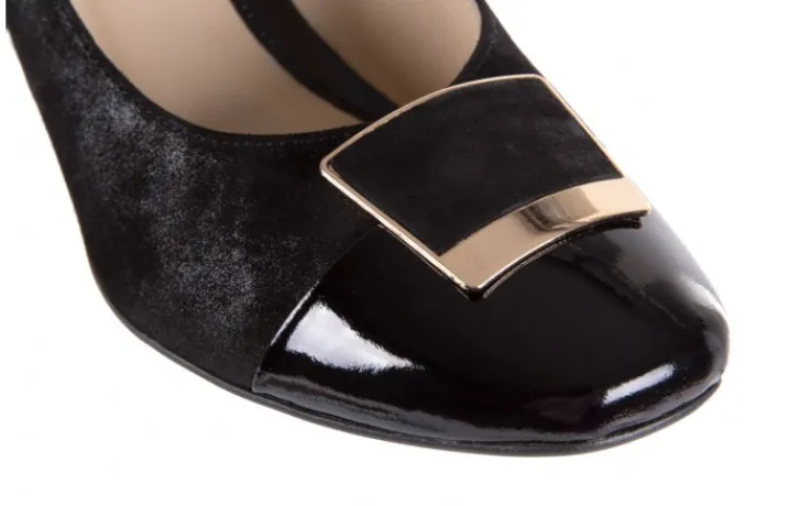 Czółenka wykonane z połączenia naturalnej skóry lakierowanej oraz nubuku. Na noskach ciekawy złoty detal, w kształcie klamry. Wyściółka oraz miękkie wkładki wykonane ze skóry naturalnej poprawią komfort podczas użytkowania. Obcasy są bardzo stabilne i wygodne.