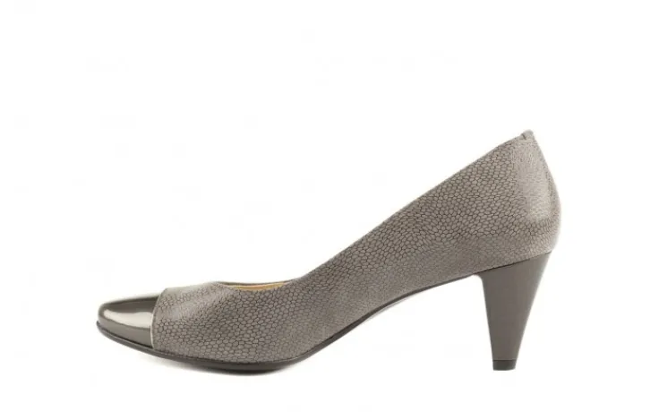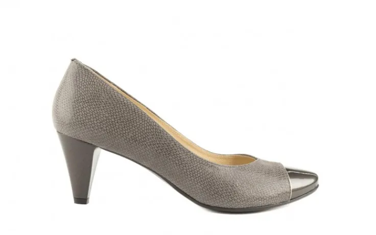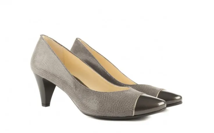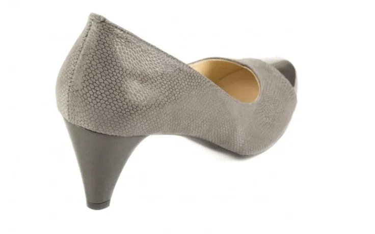 Szare czółenka marki Bayla wykonane z miękkiej, tłoczonej zamszowej skóry dekoracyjnej.