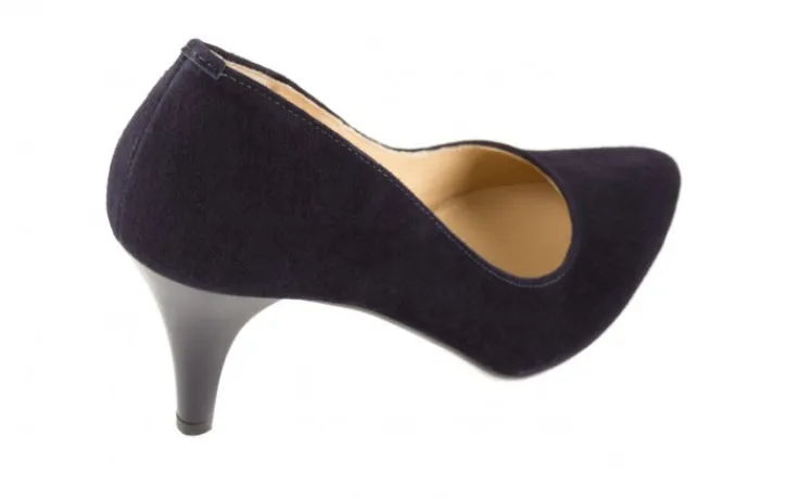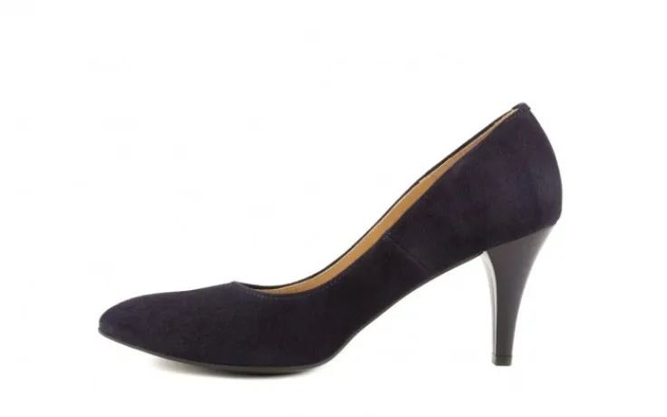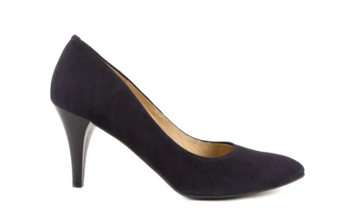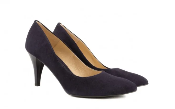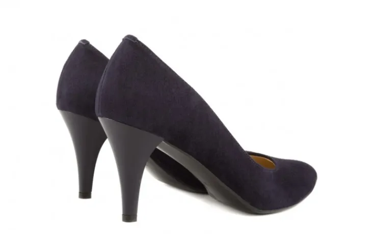 Model wykonany zamszu w kolorze granatowym. Wyściółka oraz miękkie wkładki wykonane ze skóry naturalnej poprawią komfort podczas użytkowania. Lakierowane obcasy sprawiają dodają modelowi szyku i elegancji. Obuwie jest lekkie i wygodne.