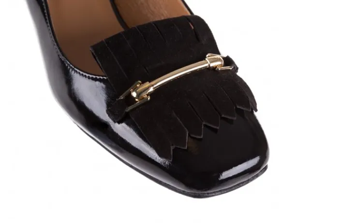 Posiadają skórzaną wkładkę i wyściółkę. Niski słupkowy czarny obcas oraz antypoślizgowa podeszwa gwarantują komfort użytkowania. Wyjątkowo zgrabnie prezentują się na stopie. Prosty, ponadczasowy fason przełamuje złoty detal przy skórzanych frędzelkach i na zewnętrznej stronie cholewki. Dzięki temu czółenka marki Bayla świetnie uzupełnią zarówno codzienne, jak i te bardziej eleganckie stylizacje.