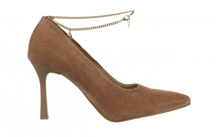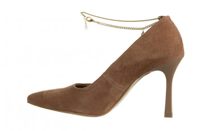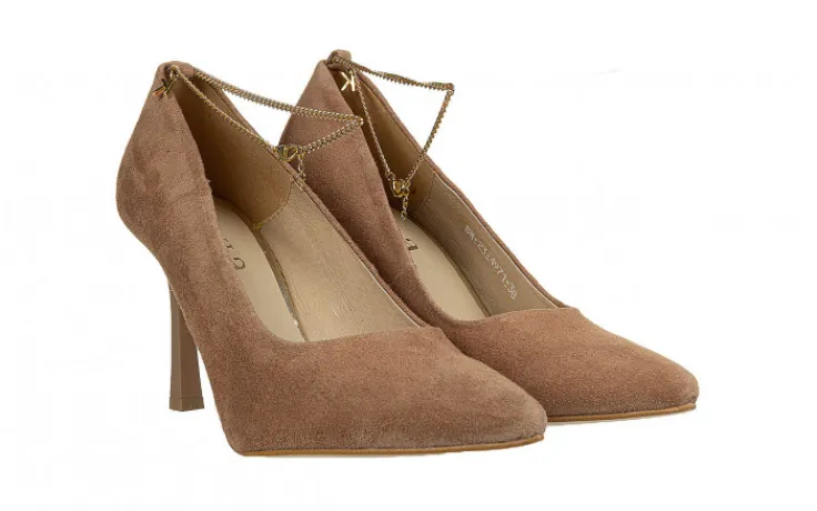 Wkładka i wyściółka wykonane są w całości ze skóry naturalnej, co znacznie podwyższa komfort użytkowania. Umiejscowienie obcasu na środku pięty sprawia, że buty są stabilne i bardzo wygodne. Dzięki wąskim noskom do szpica niezwykle zgrabnie prezentują się na nogach optycznie je wydłużając. Uroku dodaje ozdobny, odpinany łancuszek oplatający kostkę.