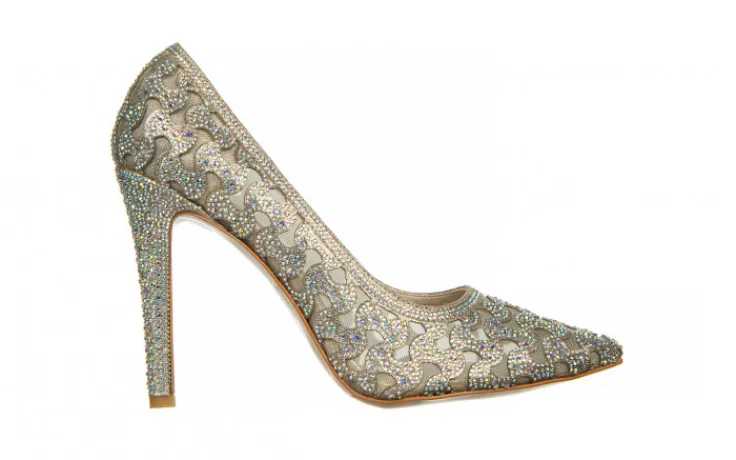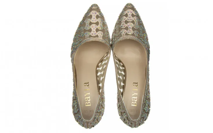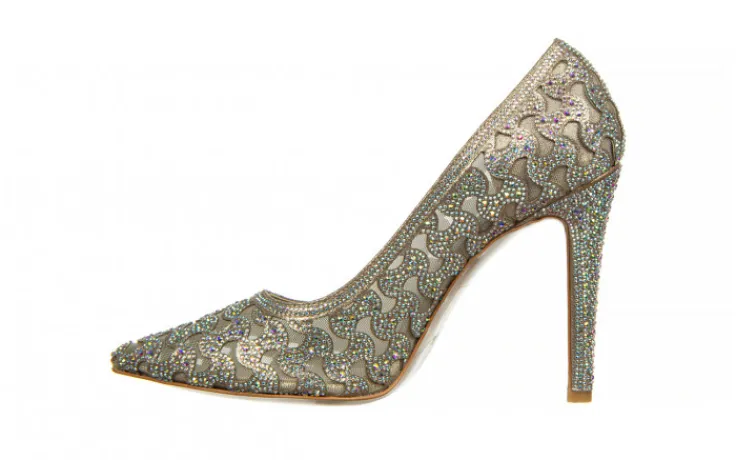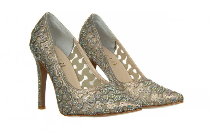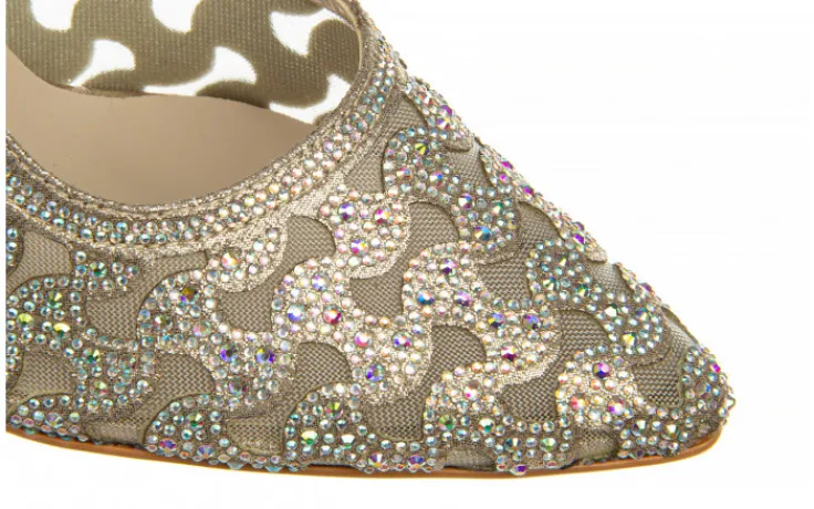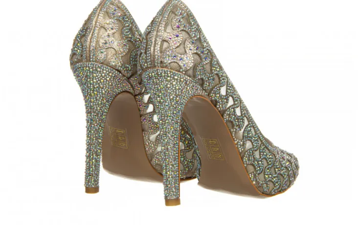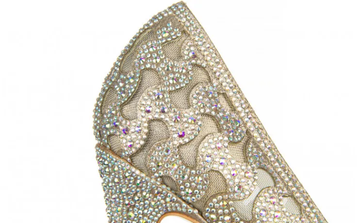Buty są lekkie, wygodne i pięknie prezentują się na nodze. Szpilki w całości pokryte są pięknie mieniącymi się kamyczkami. Kolory zmieniają się pod wpływem światła. Cholewka częściowo wykonana jest z przezroczystej złotej siateczki. Dzięki wąskim noskom do szpica niezwykle zgrabnie prezentują się na nogach. Zapiętek od wewnętrzej strony obity jest miękkim w dotyku materiałem imitującym zamsz, który jest bardzo przyjemny i komfortowy dla stopy.