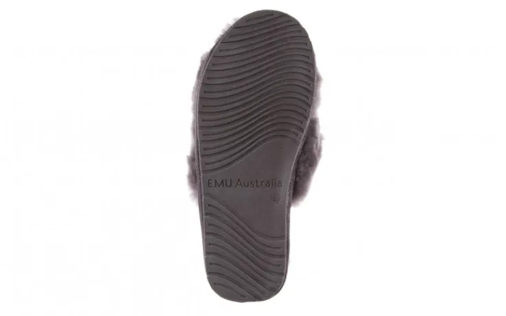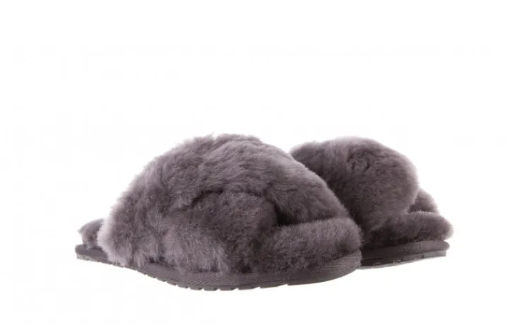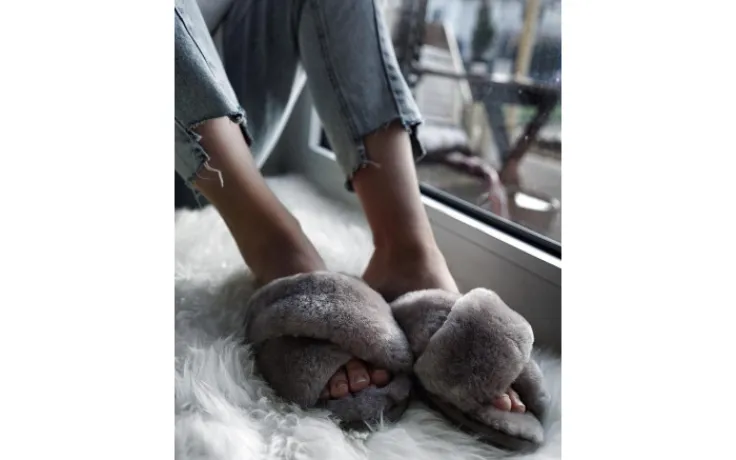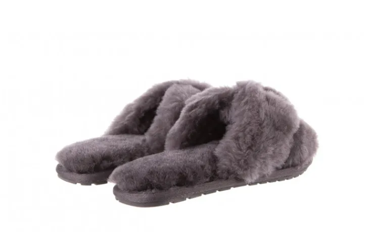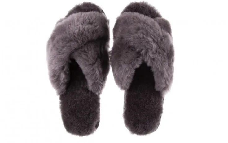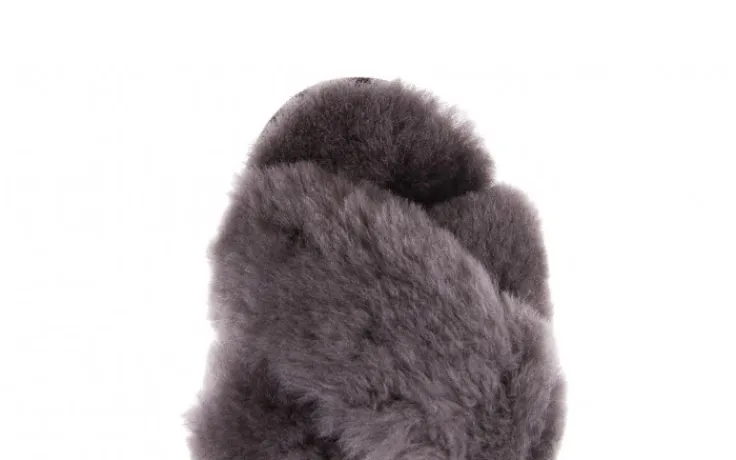 Obuwie w kolorze szarym wykonane z kożucha australijskich merynosów. Paski ułożone „na krzyż”. Wkładka oraz wyściółka z naturalnego kożucha merynosów. Podeszwa z wysokogatunkowego tworzywa sztucznego o właściwościach antypoślizgowych. Kożuch z jednej strony zapewnia ciepło, a z drugiej przepuszcza powietrze i zapobiega poceniu się stóp. Niezwykle wygodne.