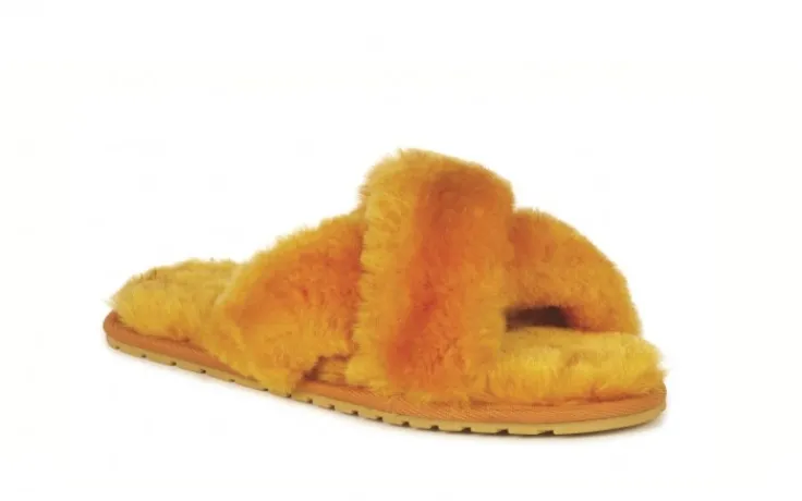 Obuwie w kolorze musztardowym wykonane z kożucha australijskich merynosów. Paski ułożone „na krzyż”. Wkładka oraz wyściółka z naturalnego kożucha merynosów. Podeszwa z wysokogatunkowego tworzywa sztucznego o właściwościach antypoślizgowych. Kożuch z jednej strony zapewnia ciepło, a z drugiej przepuszcza powietrze i zapobiega poceniu się stóp. Niezwykle wygodne.
