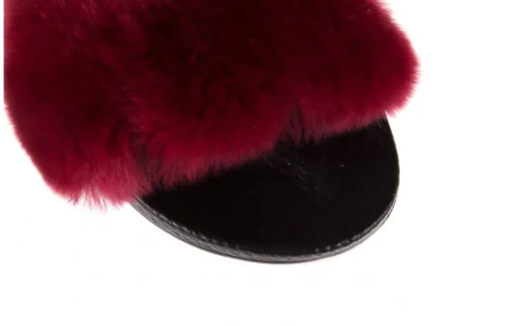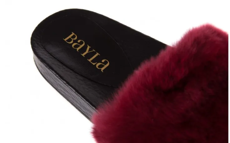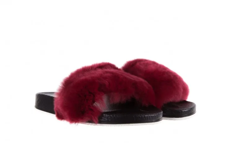 Buty na czarnej profilowanej podeszwie. Wyściółka ze skóry naturalnej. Pasek ze skóry pokryty w całości naturalnym futrem z królika w kolorze burgundowym.