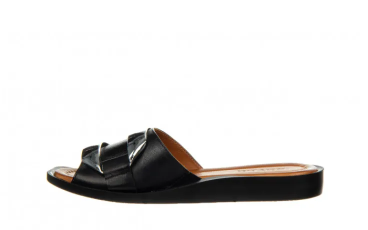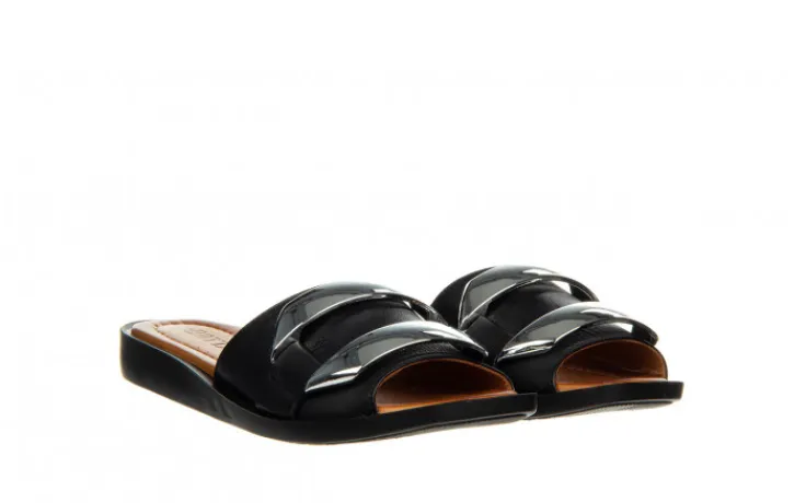Eleganckie klapki na czarnej, matowej podeszwie z modnym kwadratowym czubkiem. Skórzany pasek na przodzie ze srebrną ozdobą. Skórzane wkładki. Buty idealnie sprawdzają się na co dzień podczas ciepłych, letnich dni.
