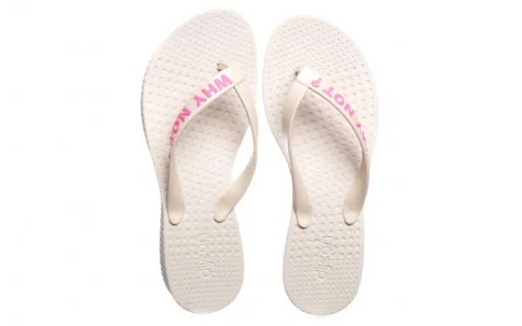 Antypoślizgowa podeszwa wykonana jest z wysokiej jakości syntetycznego materiału, co zapewnia wygodę użytkowania. Model typu japonek składa się z beżowych paseczków, na jednym z nich różowy napis” WHY NOT?”
