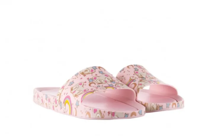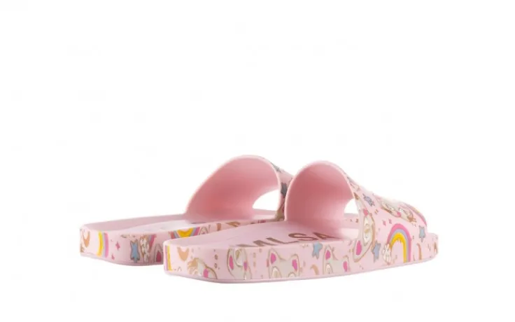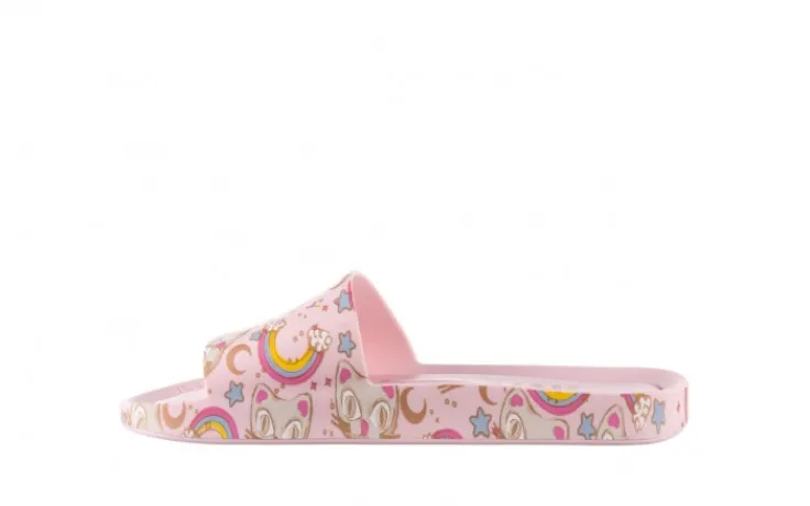 Obuwie wykonane z tworzywa Mel-Flex niezwykle wytrzymałe oarz wygodne. Buty składają się z jednego grubego paska, na którym znajdują się zabawne printy kota, tęczy oraz gwiazd. Bardzo miękka wkładka oraz gruba podeszwa o wysokości 2,5 cm.