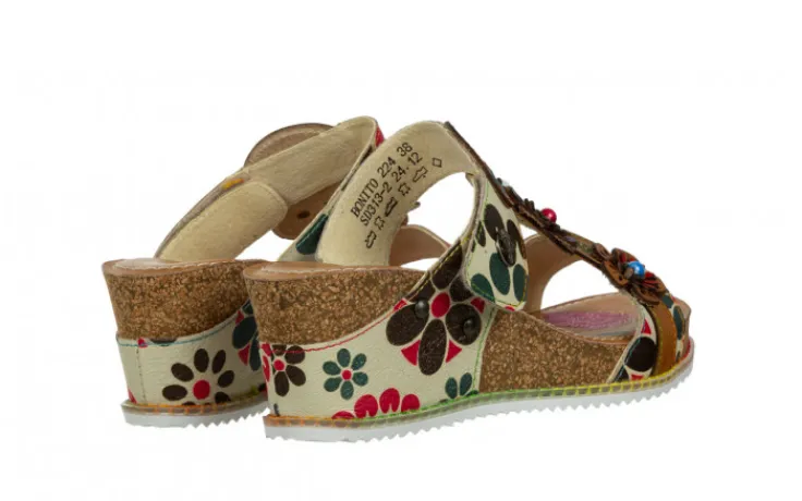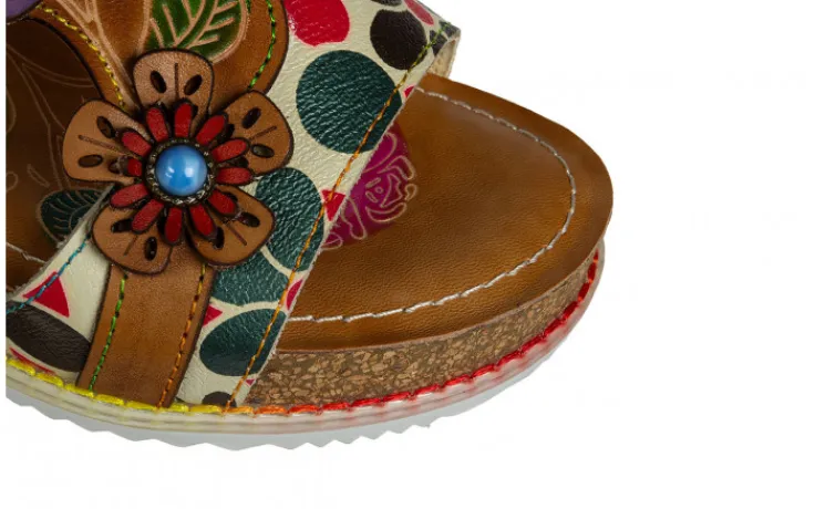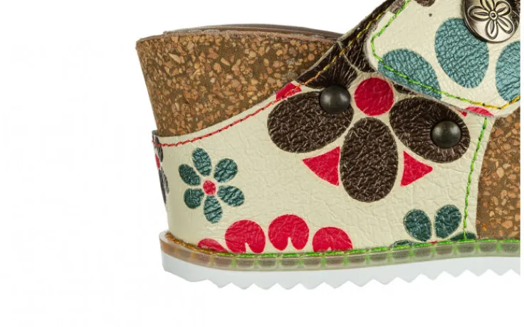Klapki damskie charakteryzujące się unikalnym designem i wysoką jakością wykonania. Cholewka została wykonana z naturalnej skóry w beżowym kolorze, ozdobionej kolorowymi, ręcznie wykonanymi aplikacjami kwiatowymi oraz motywami, nadającymi obuwiu artystyczny charakter. Klapki posiadają stabilny koturn o wysokości około 6 cm oraz platformę o wysokości 2 cm, co zapewnia komfort noszenia. Zapięcie na rzep umożliwia dopasowanie obuwia do stopy. Miękka, skórzana wkładka oraz elastyczna podeszwa gwarantują wygodę podczas codziennego użytkowania.