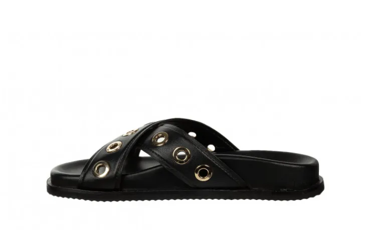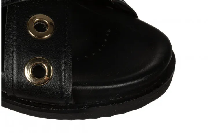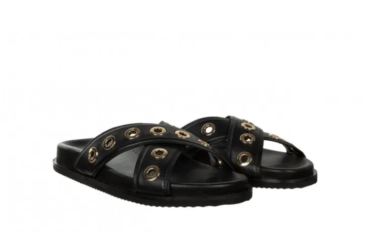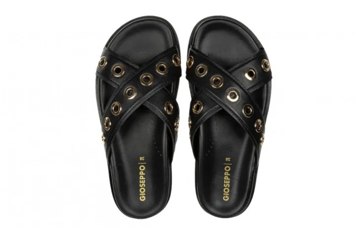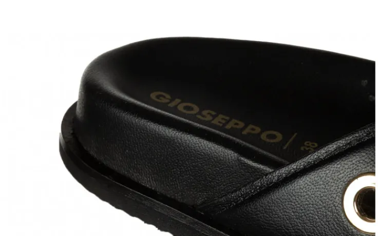 Klapki hiszpańskiej marki Gioseppo w kolorze czarnym ze złotymi aplikacjami.