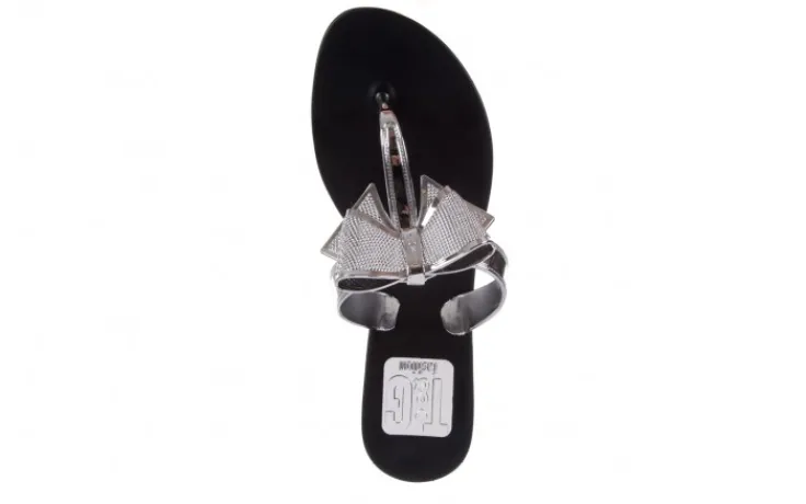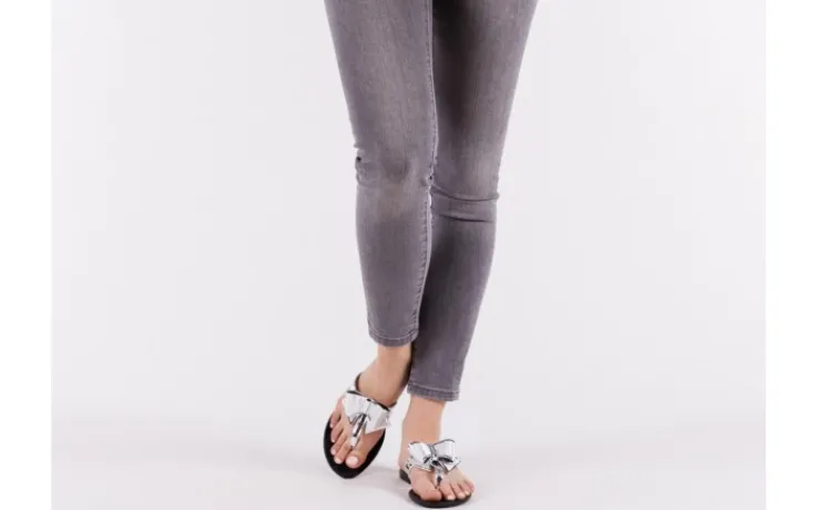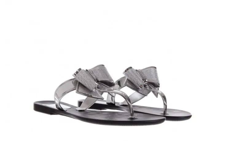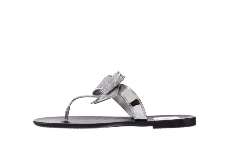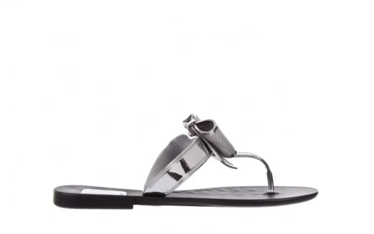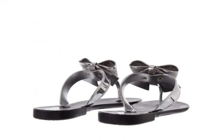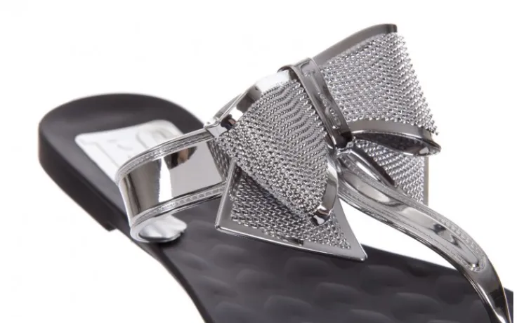 Klapki marki F&G Fashion. Grubsze srebrne paski przyozdobione dużą srebrną zdobioną kokardą. Model ten będzie się idealnie komponował ze wszystkimi letnimi stylizacjami.